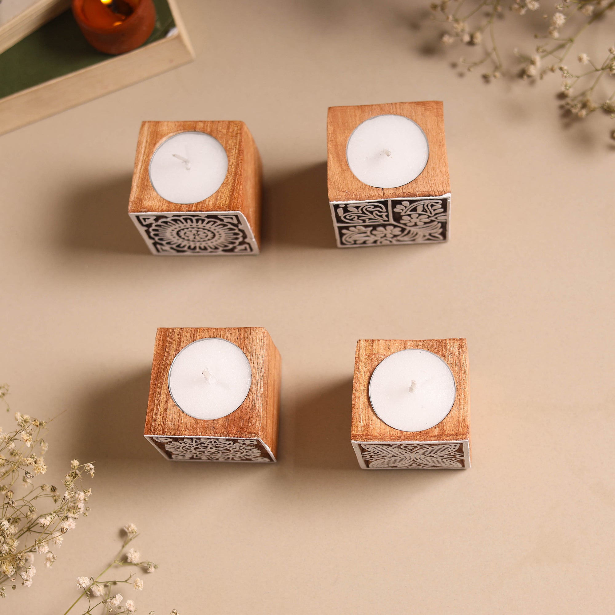 Add an artisanal touch to your home with this set of 4 hand-carved tealight holders, crafted from natural bakayan wood. Meticulously carved using traditional wood block techniques, these tealight holders light up your space but can also be used as printing blocks on fabric or paper. A harmonious blend of utility and décor, handmade by skilled Indian artisans.