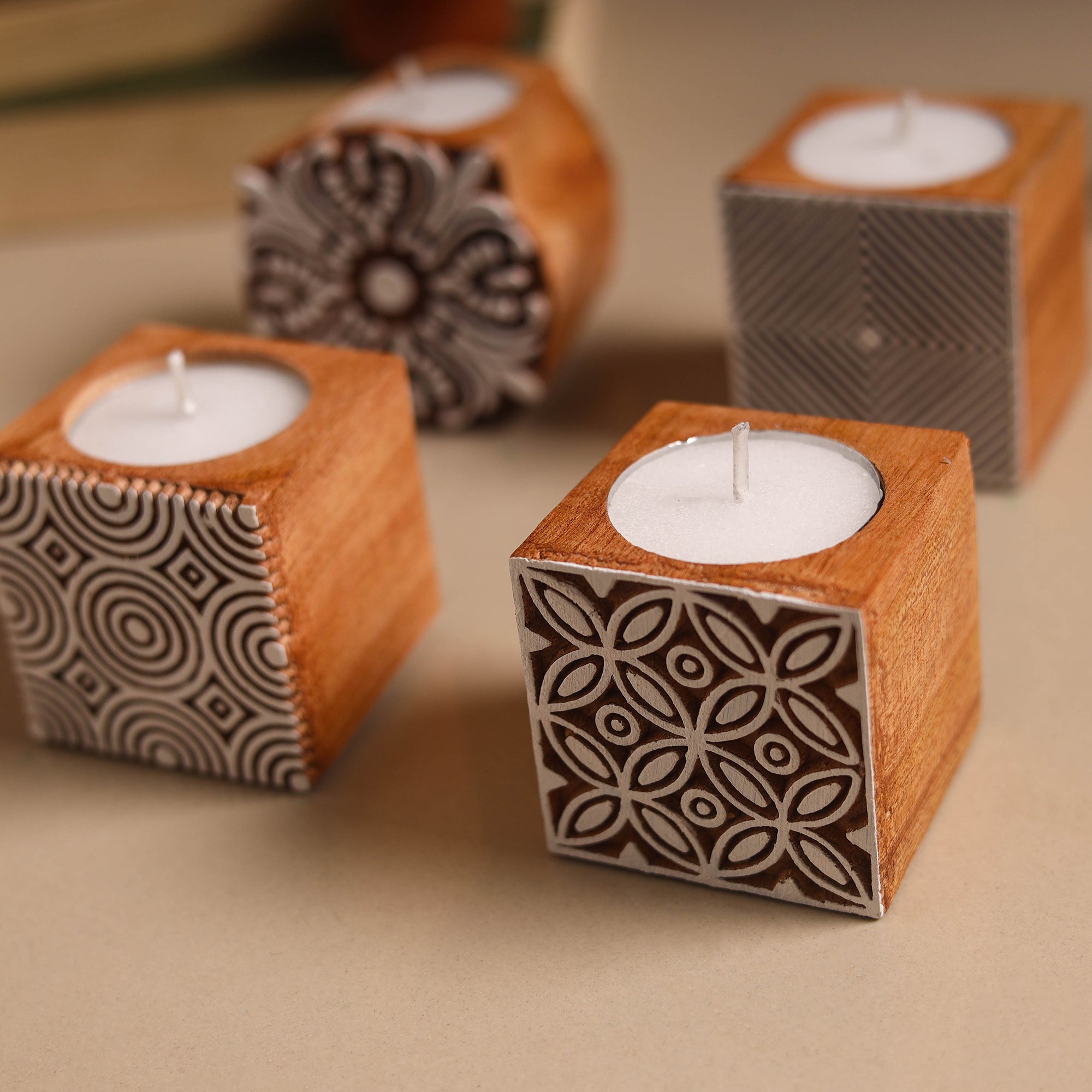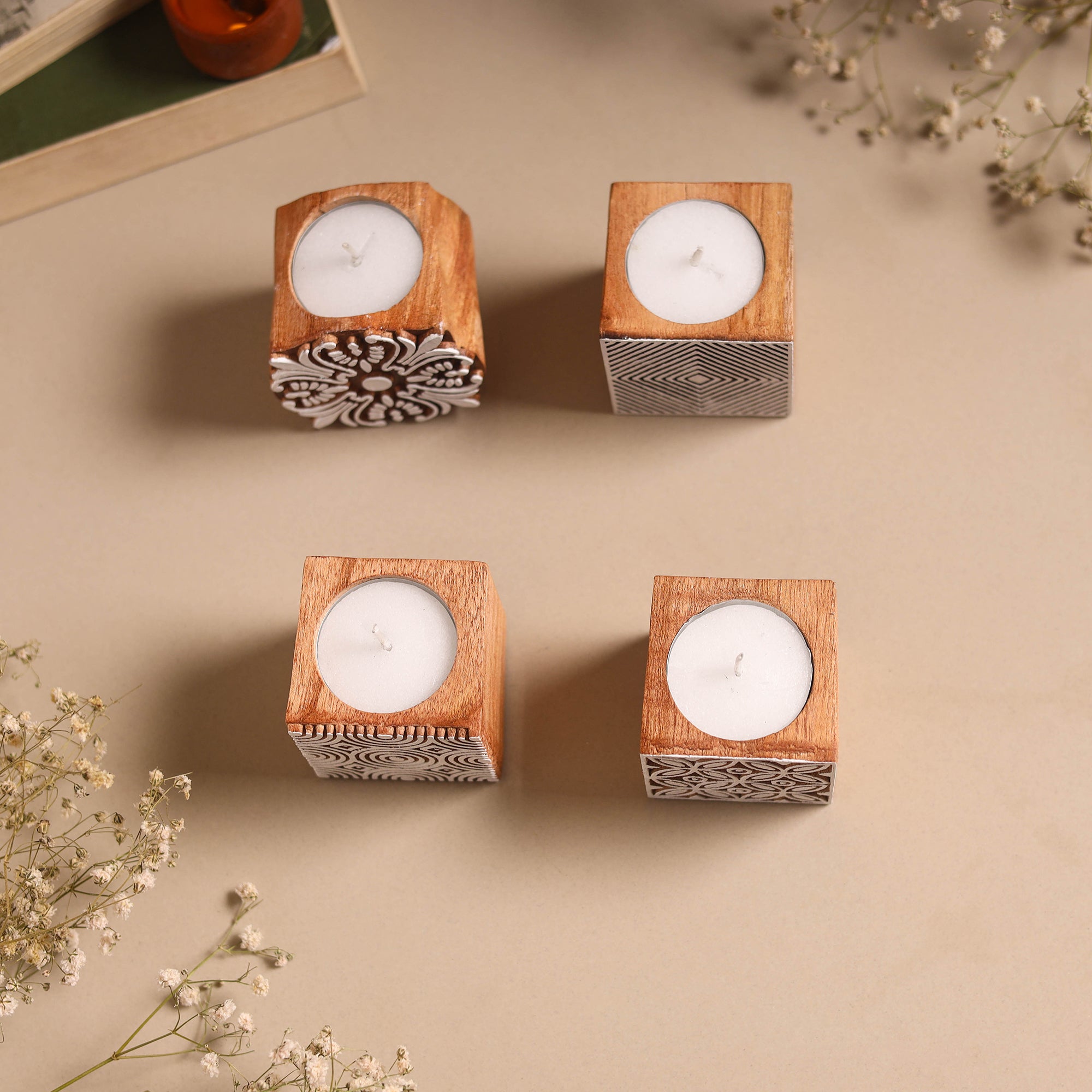 Add an artisanal touch to your home with this set of 4 hand-carved tealight holders, crafted from natural bakayan wood. Meticulously carved using traditional wood block techniques, these tealight holders light up your space but can also be used as printing blocks on fabric or paper. A harmonious blend of utility and décor, handmade by skilled Indian artisans.