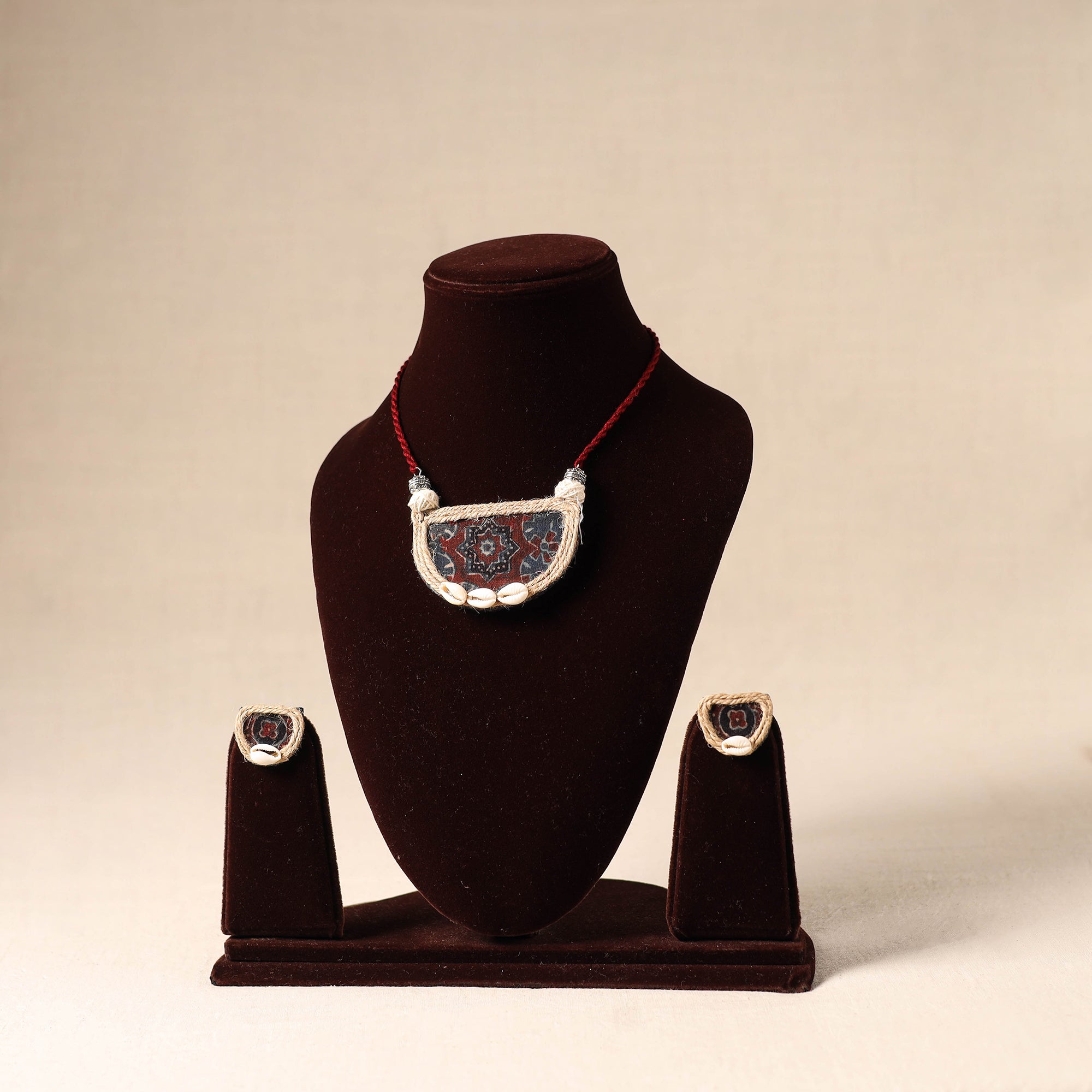 Add a touch of handmade charm with this red necklace set, crafted from thread and adorned with a fabric jute pendant enhanced by shell work. The set includes matching earrings to complete your look. Made by skilled artisans, it’s lightweight and pairs effortlessly with traditional outfits. Ideal for festive occasions, cultural events, or simply for adding a unique flair to your everyday style.