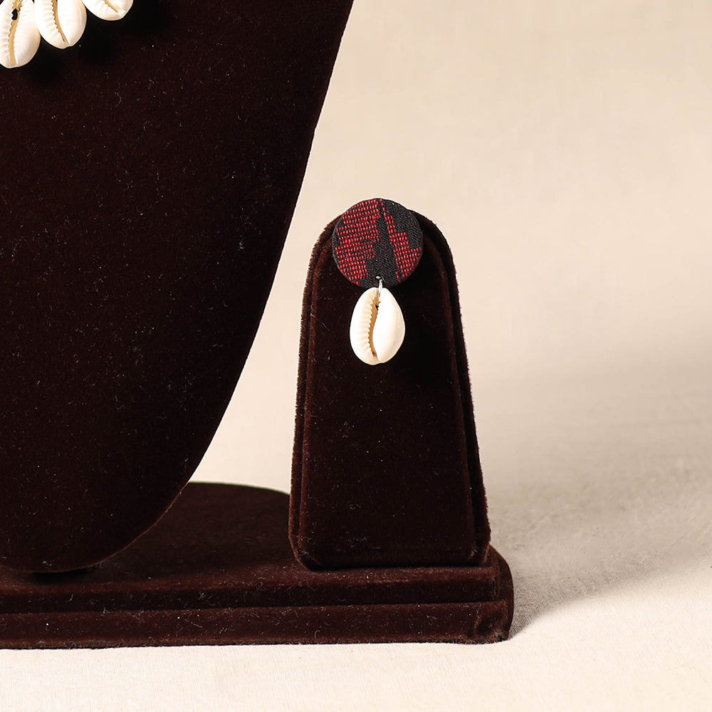 Add a touch of handmade charm with this red necklace set, made from thread and adorned with a fabric pendant featuring delicate shell work. It also comes with matching earrings to complete your look. Crafted by skilled artisans, it's lightweight and pairs effortlessly with traditional outfits. Ideal for festive occasions, cultural events, or simply to bring a distinctive touch to your style.
