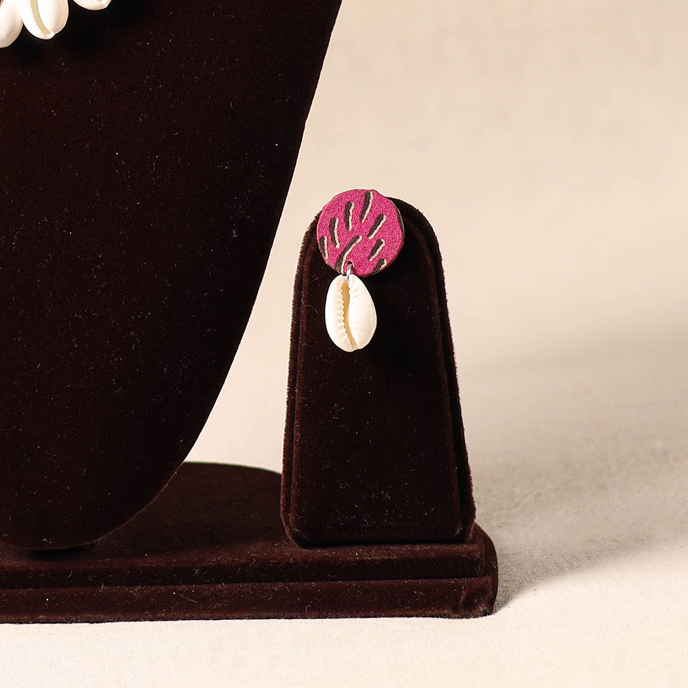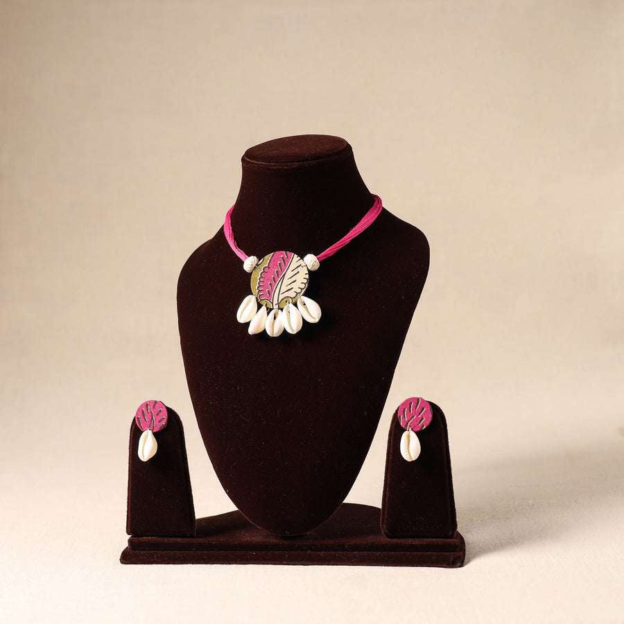 Add a touch of handmade charm with this pink necklace set, made from thread and adorned with a fabric pendant featuring delicate shell work. It also comes with matching earrings to complete your look. Crafted by skilled artisans, it's lightweight and pairs effortlessly with traditional outfits. Ideal for festive occasions, cultural events, or simply to bring a distinctive touch to your style.