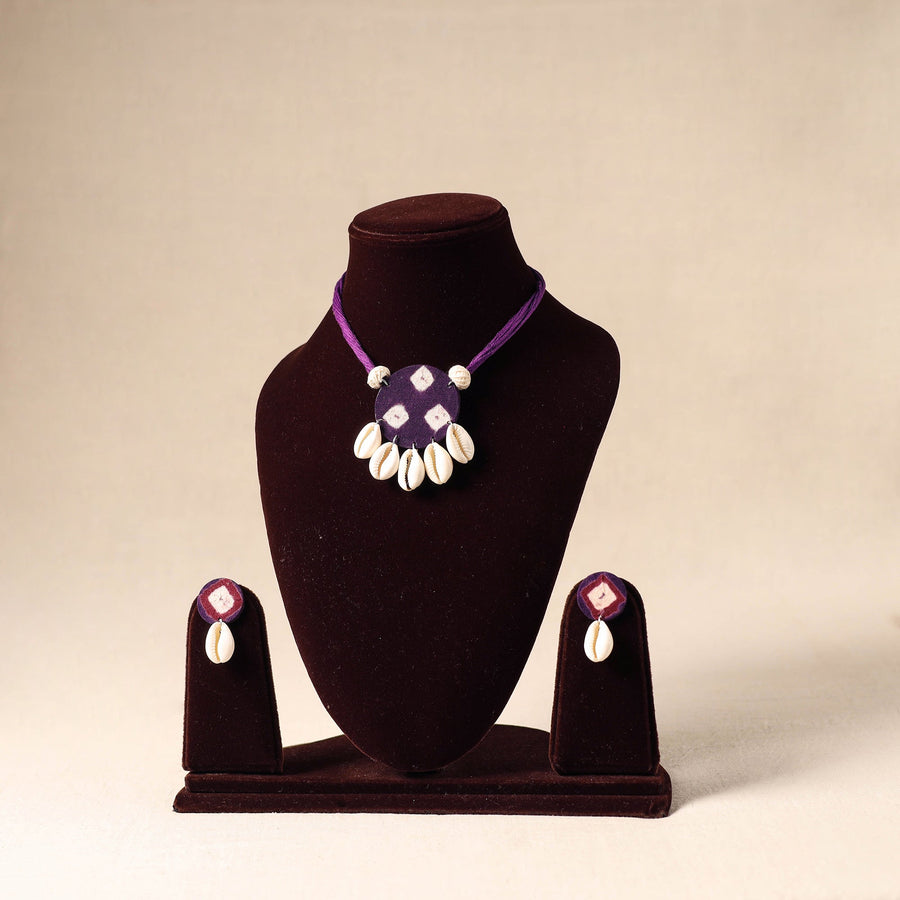 Add a touch of handmade charm with this purple necklace set, made from thread and adorned with a fabric pendant featuring delicate shell work. It also comes with matching earrings to complete your look. Crafted by skilled artisans, it's lightweight and pairs effortlessly with traditional outfits. Ideal for festive occasions, cultural events, or simply to bring a distinctive touch to your style.