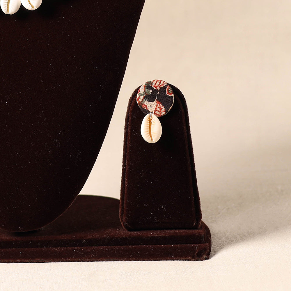 Add a touch of handmade charm with this black necklace set, made from thread and adorned with a fabric pendant featuring delicate shell work. It also comes with matching earrings to complete your look. Crafted by skilled artisans, it's lightweight and pairs effortlessly with traditional outfits. Ideal for festive occasions, cultural events, or simply to bring a distinctive touch to your style.