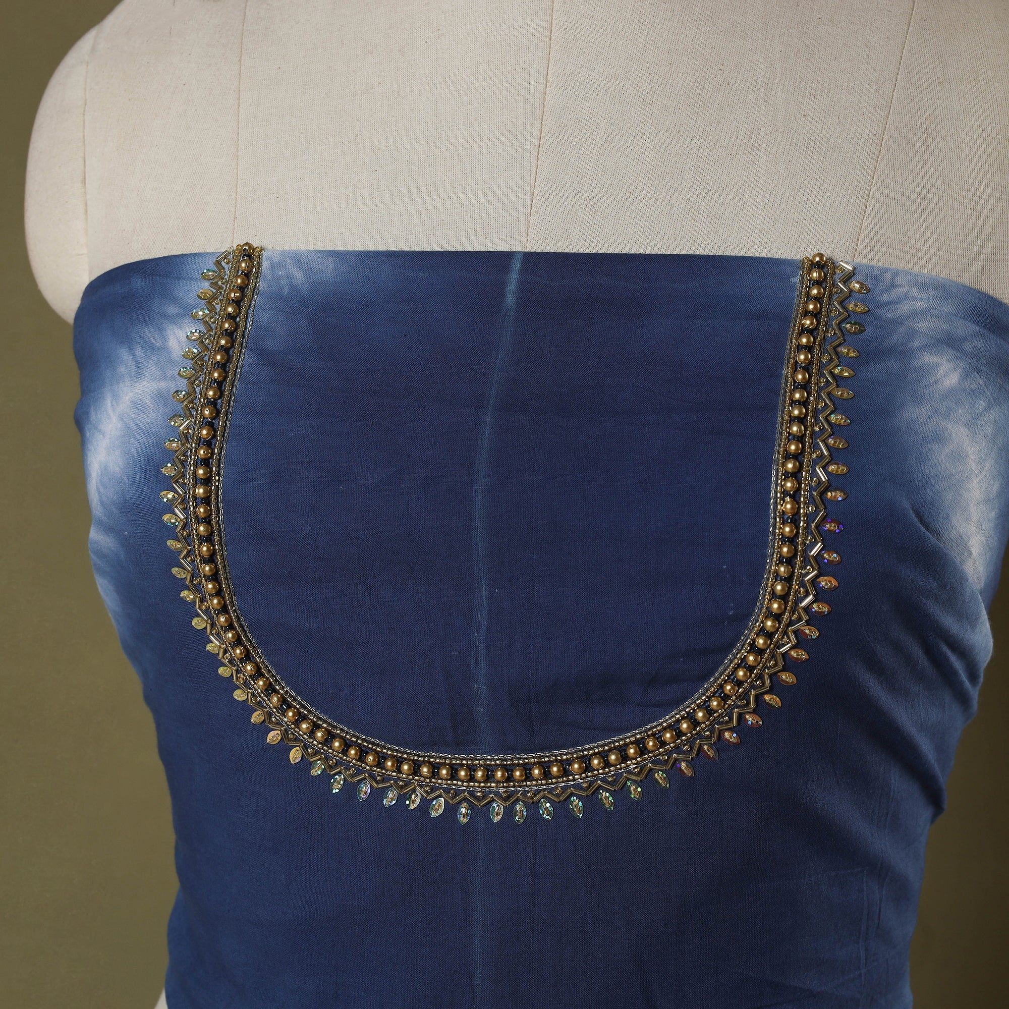 This handcrafted blue blouse piece features detailed hand embroidery on shibori tie-dye cotton fabric, blending traditional textile art with everyday comfort. Ideal for pairing with sarees, it can be tailored into elegant blouses suited for both casual and festive occasions.