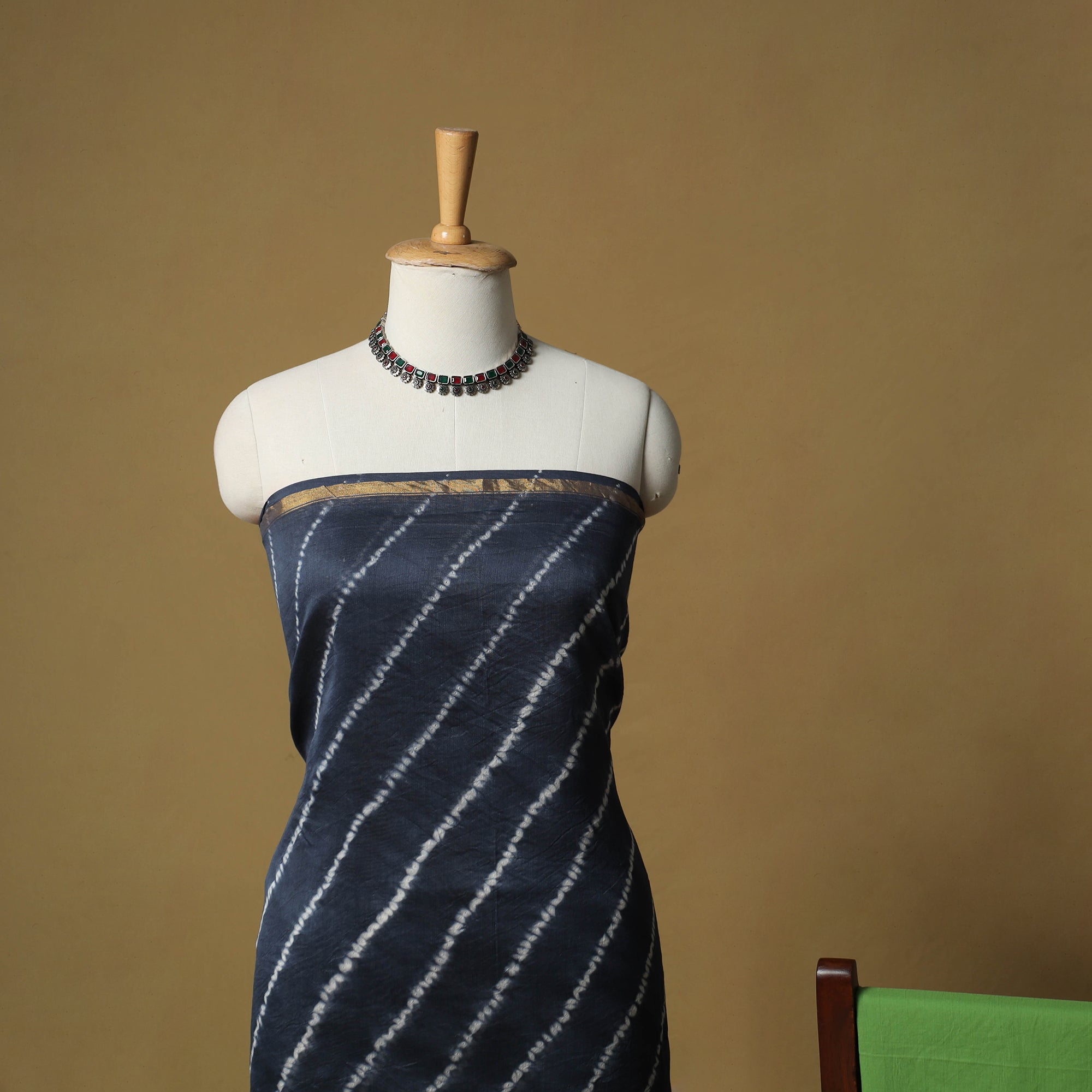 | Material | Shibori tie-dye chanderi silk cotton 3pc unstitched dress material beautifully blends traditional artistry with everyday comfort. Created using a centuries old shibori tie-dye technique, the fabric is carefully bound and hand-dyed to form unique, intricate patterns. Crafted by skilled artisans from Rajasthan, the set includes kurta fabric and a dupatta in chanderi silk cotton, paired with a plain cotton bottom. It offers breathable comfort, making it suitable for daily wear as well as special occasions. |