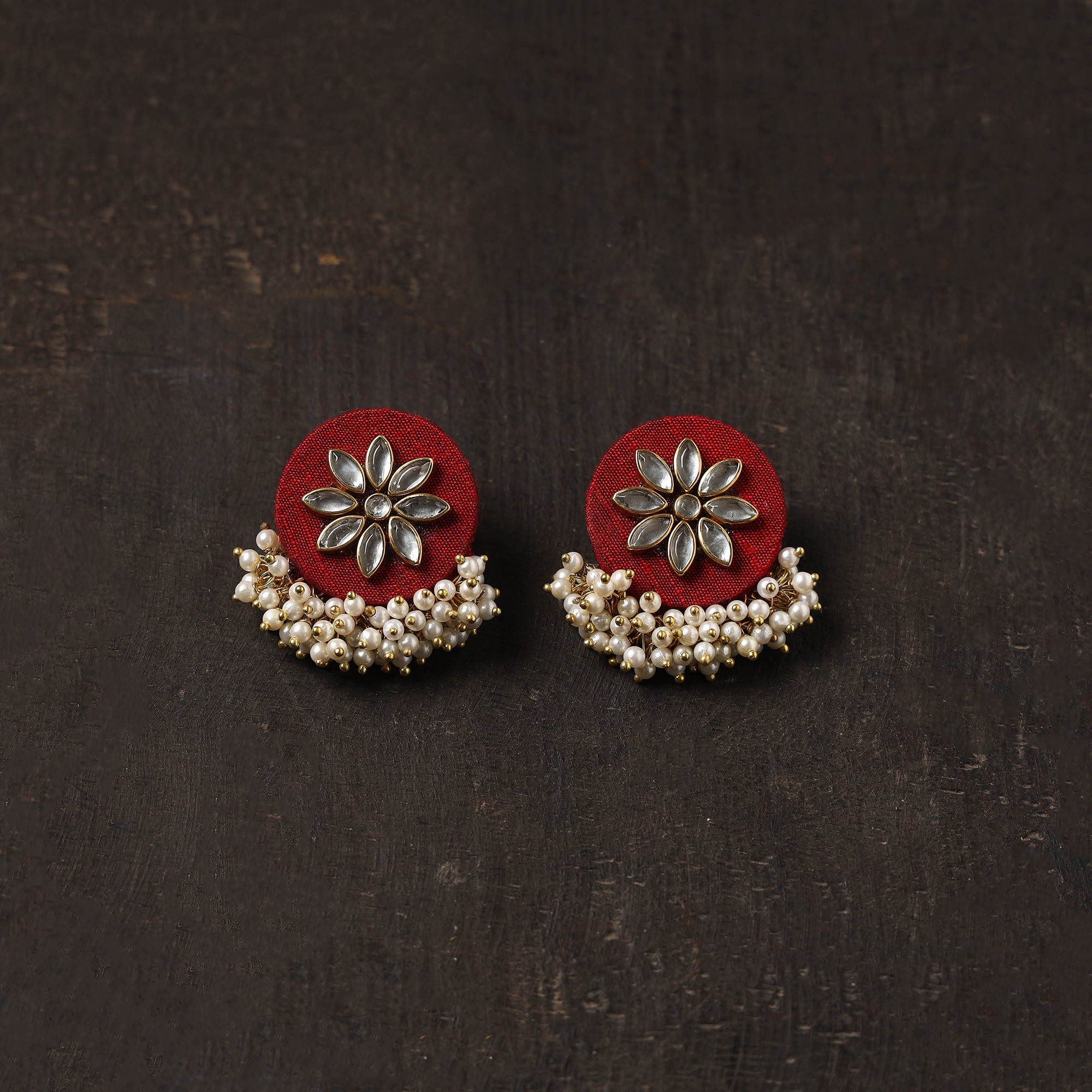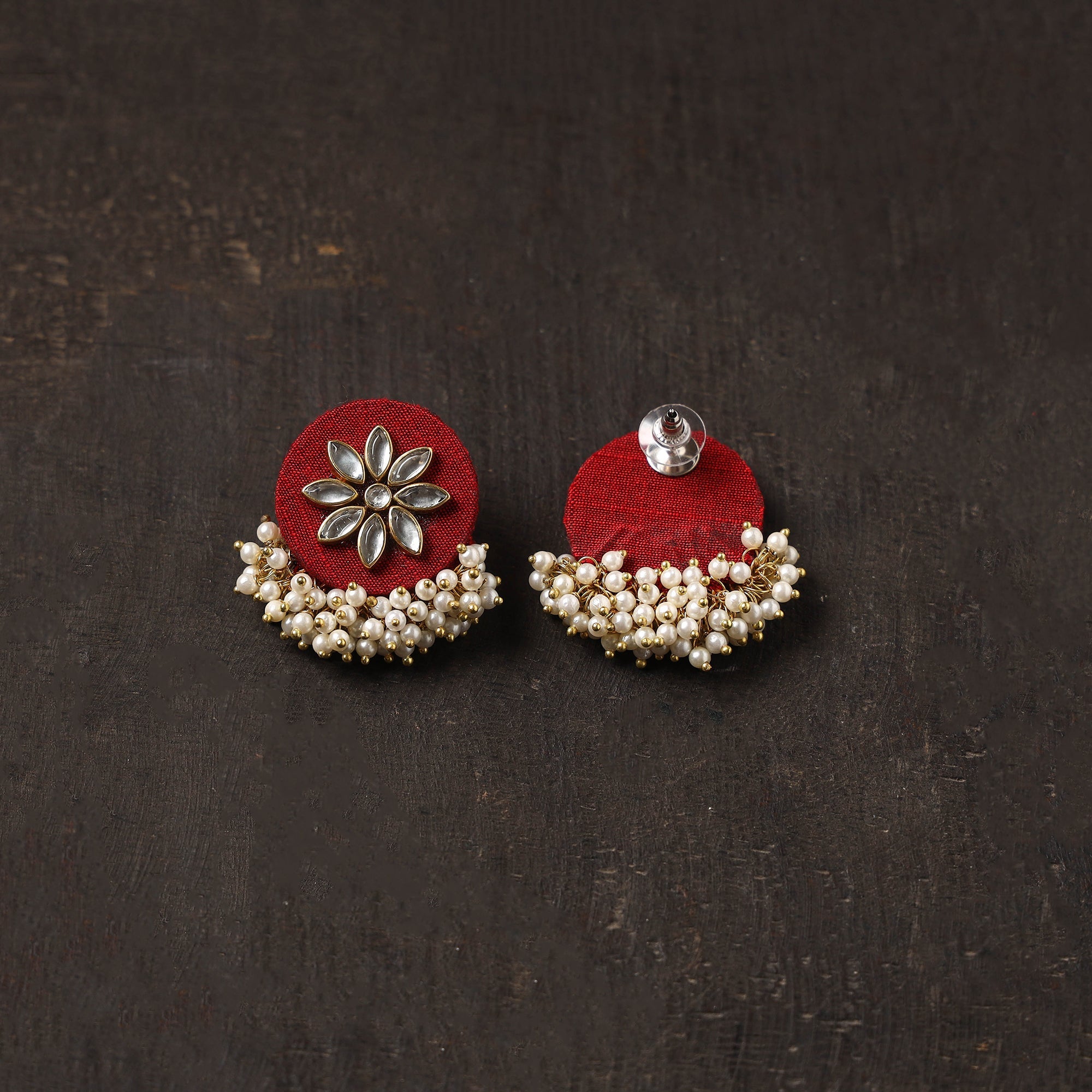 Handcrafted red fabric earrings are beautifully detailed with kundan work and delicate beads. Made by skilled women artisans, they offer a lightweight and perfect for adding a unique charm to festive and everyday looks.