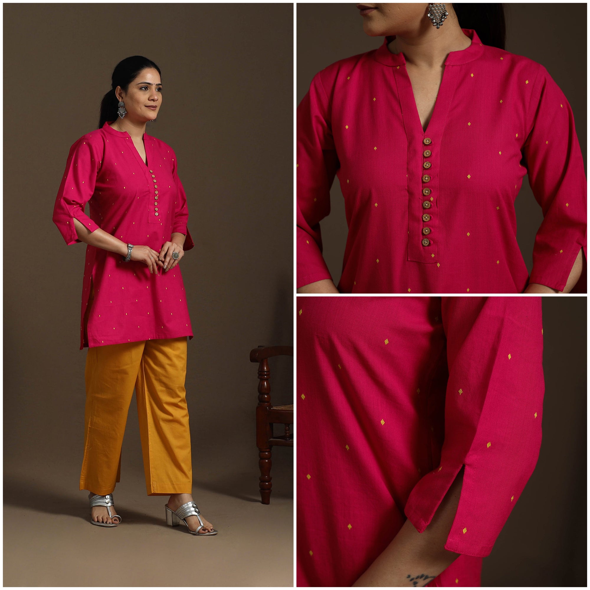 Stay stylish and comfortable in this pink short cotton jacquard kurta. The jacquard weave embeds patterns directly into the fabric, adding a soft texture you can both see and feel. This kurta is perfect for office wear or a relaxed day out.