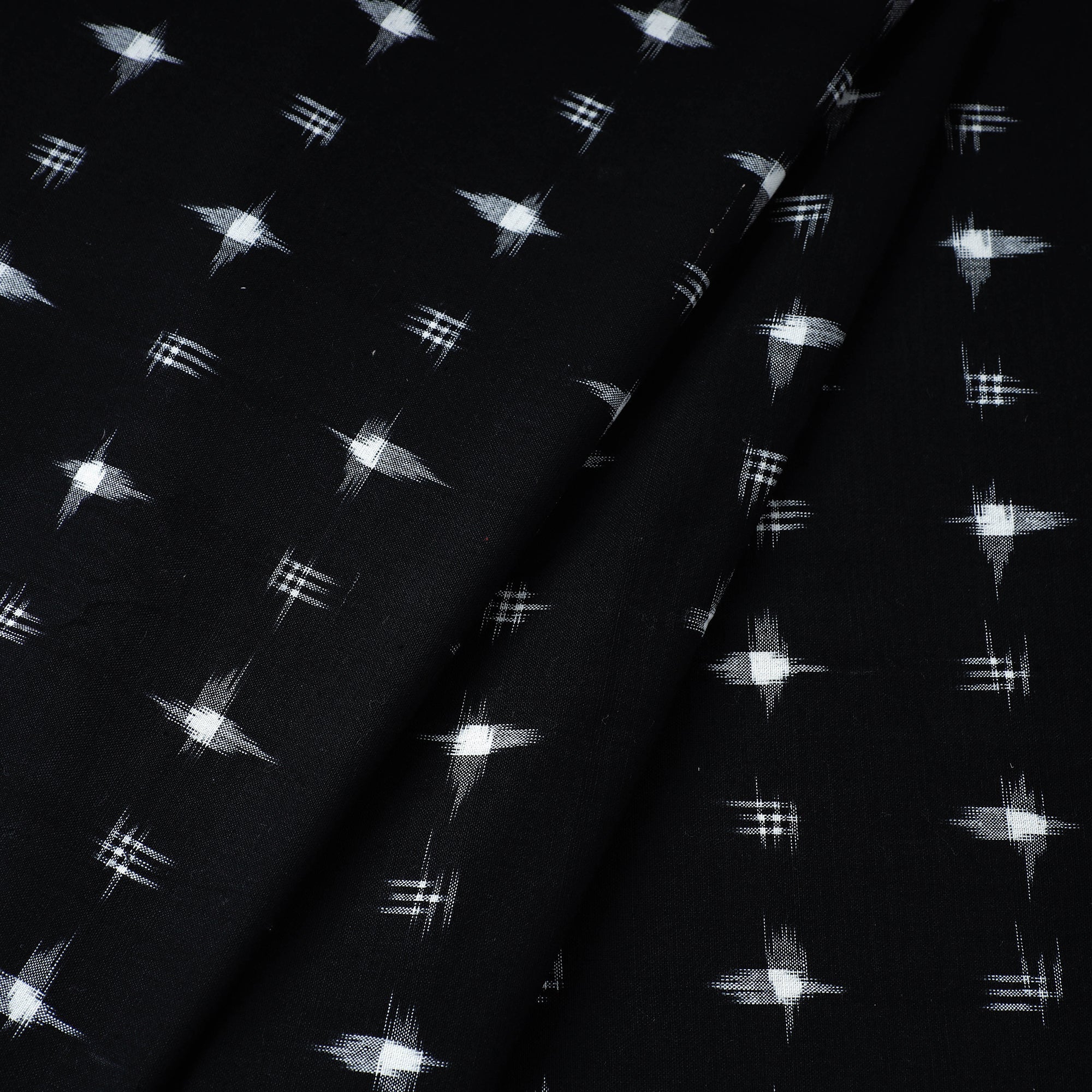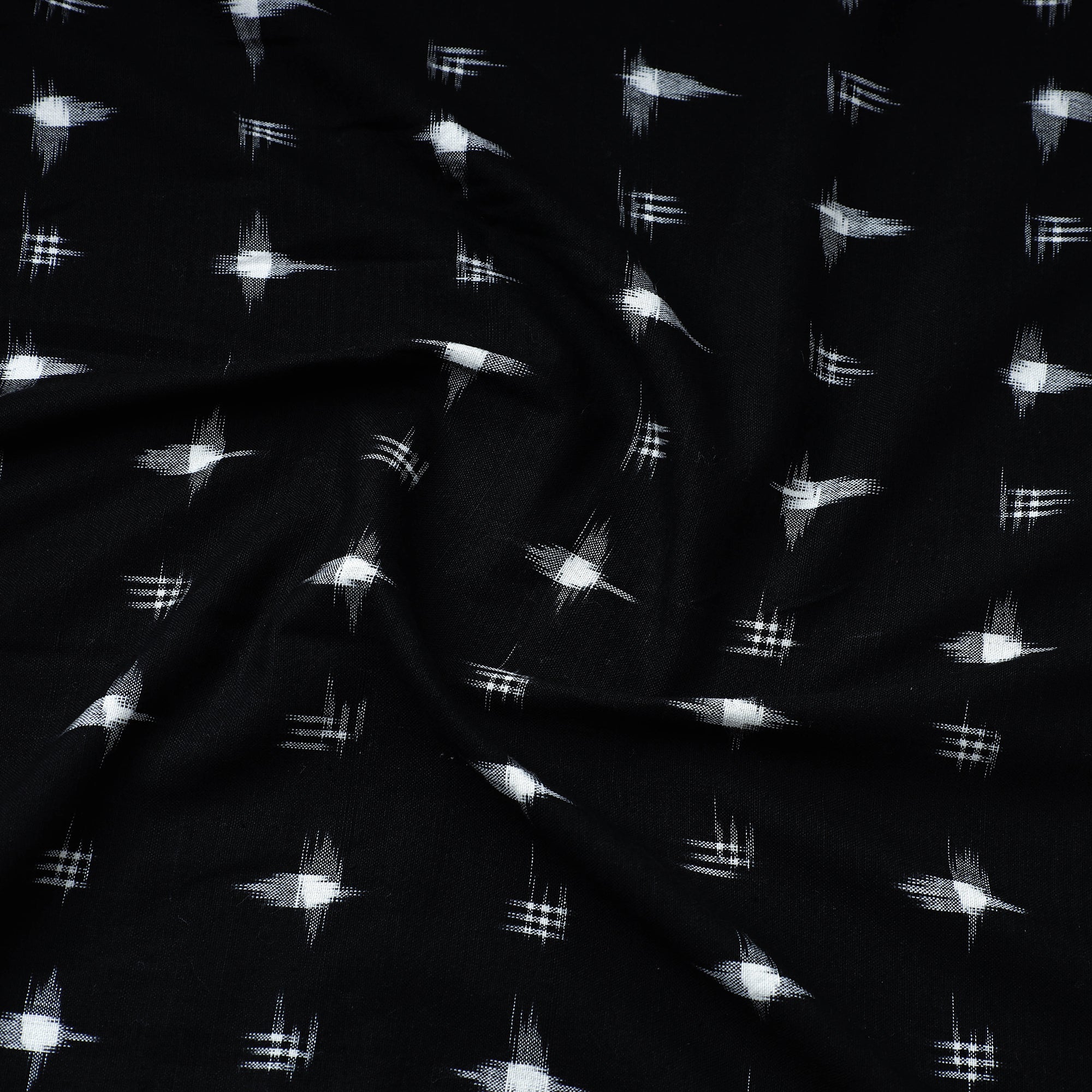 Add a touch of heritage to your creations with this black handloom cotton pochampally double ikat fabric from Telangana. Known for its intricate weaving technique, this fabric boasts vibrant colors and unique patterns achieved through a resist dyeing process. perfect for ethnic wear, décor or custom designs.This piece carries tiny knots, thread pulls, or uneven lines — not flaws, but fingerprints. Every irregularity is a whisper from the hands that made it. It’s what happens when tradition weaves through time, not machines. If you’re looking for perfection, this isn’t it. But if you’re looking for soul — you’ve found it.