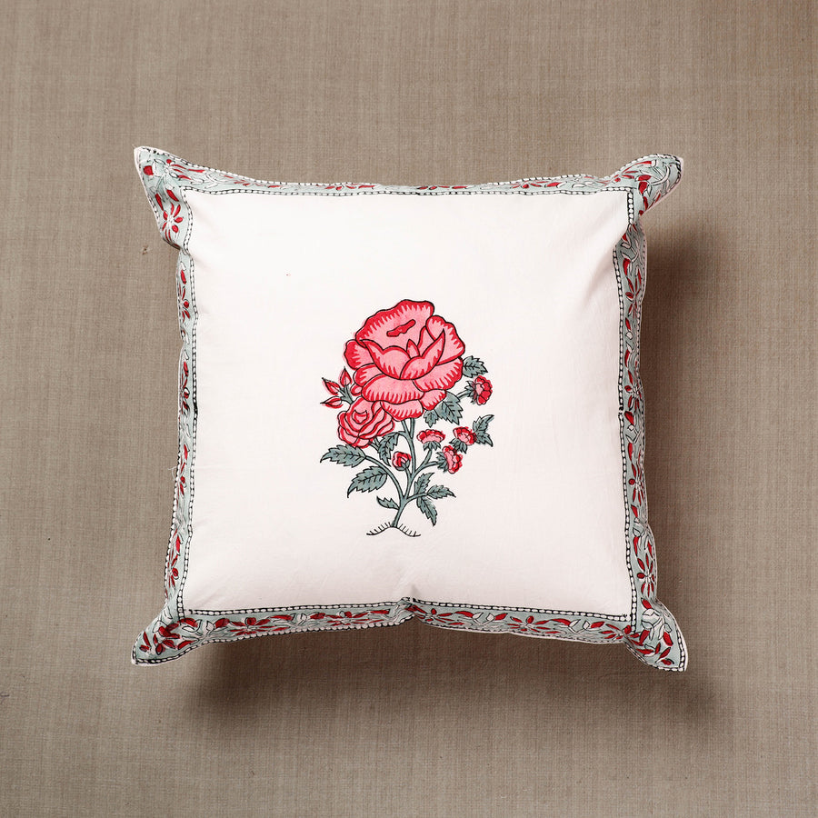 Fine quality white sanganeri hand block printed cotton cushion cover by Uttam Nagar. Sanganeri is a hand-block printing technique originating from Sanganer, a village in the southern part of Jaipur, Rajasthan. Bleed free VAT dyes used.