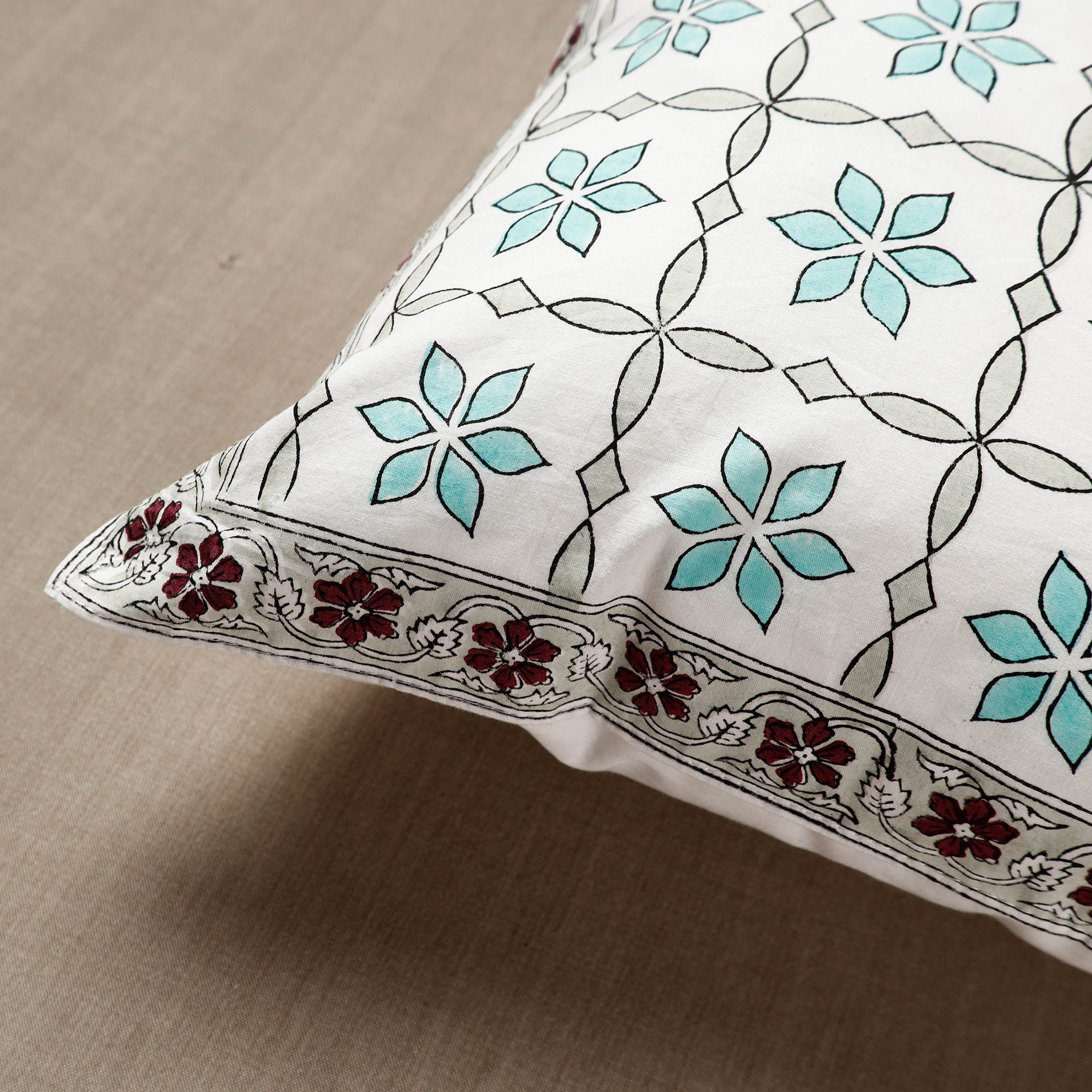 Fine quality white sanganeri hand block printed cotton cushion cover by Uttam Nagar. Sanganeri is a hand-block printing technique originating from Sanganer, a village in the southern part of Jaipur, Rajasthan. Bleed free VAT dyes used.