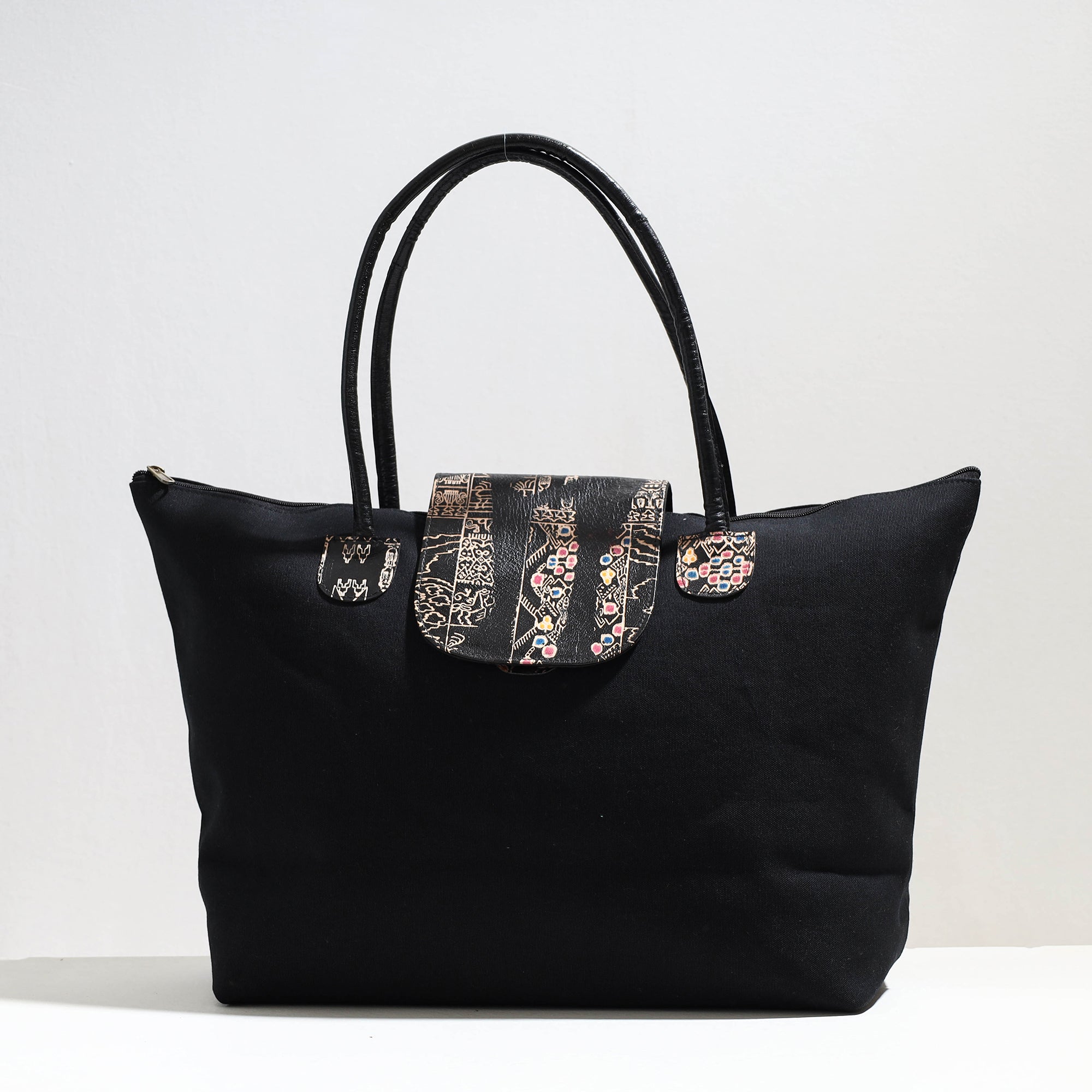 Fine quality black canvas cotton and embossed shanti leather flap tote bag handcrafted by the master artisans of West Bengal. This versatile bag features a convenient interior zipper pocket and ample space for all your essentials. Perfect for everyday use, it seamlessly combines fashion and functionality, ensuring you stay organized and chic wherever you go. Embossed leather products are made using vegetable tanned leather. Every piece is embossed using a metal die, after which it is individually painted by hand using spirit colours. Each product is then constructed by hand. With time it becomes softer and deeper in colour as is the natural characteristic of leather.