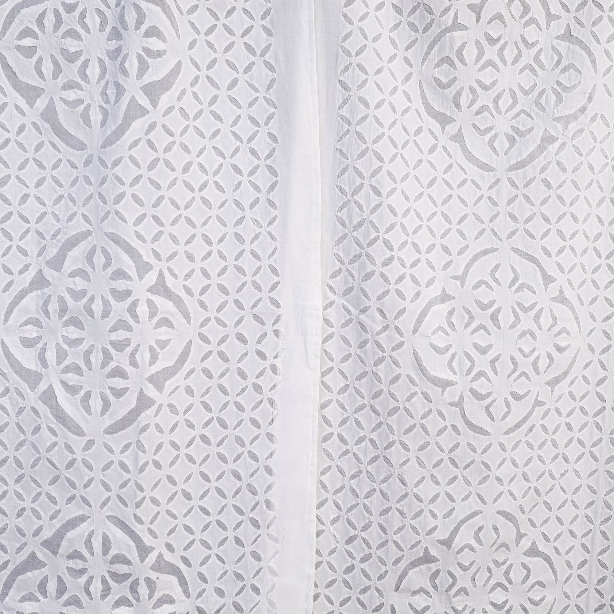 Fine quality white hand stitched traditional applique cutwork window curtain made from organdy cotton fabric. The applique cutwork window curtain from barmer is a stunning home decor piece that adds elegance to any space. Its unique style appliqué work does magic in light and shade with beautiful stories and patterns. it diffuses soft, natural light while providing privacy. This curtain serves as a stylish window treatment, enhancing the ambiance of your room with its exquisite craftsmanship and timeless appeal.