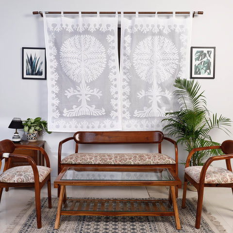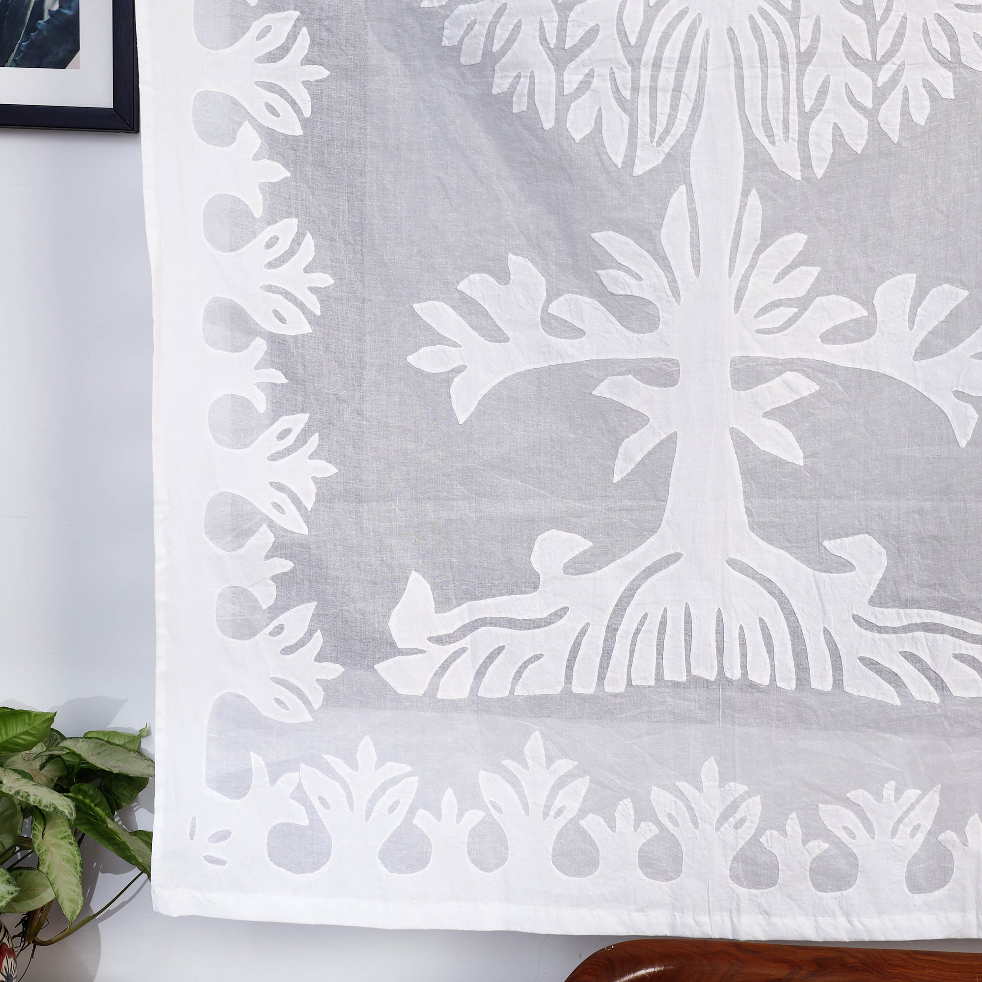 Fine quality white hand stitched traditional applique cutwork window curtain made from organdy cotton fabric. The applique cutwork window curtain from barmer is a stunning home decor piece that adds elegance to any space. Its unique style appliqué work does magic in light and shade with beautiful stories and patterns. it diffuses soft, natural light while providing privacy. This curtain serves as a stylish window treatment, enhancing the ambiance of your room with its exquisite craftsmanship and timeless appeal.