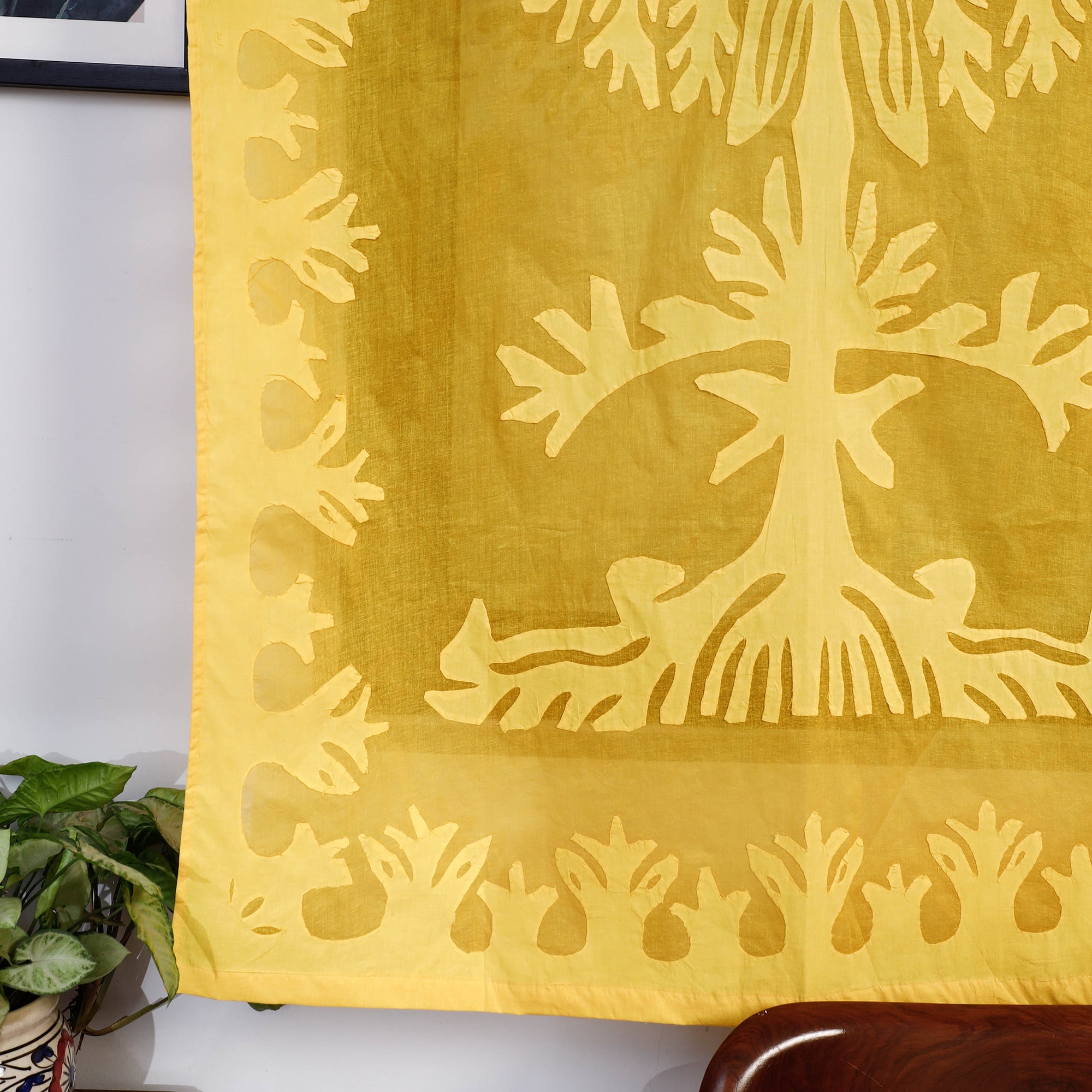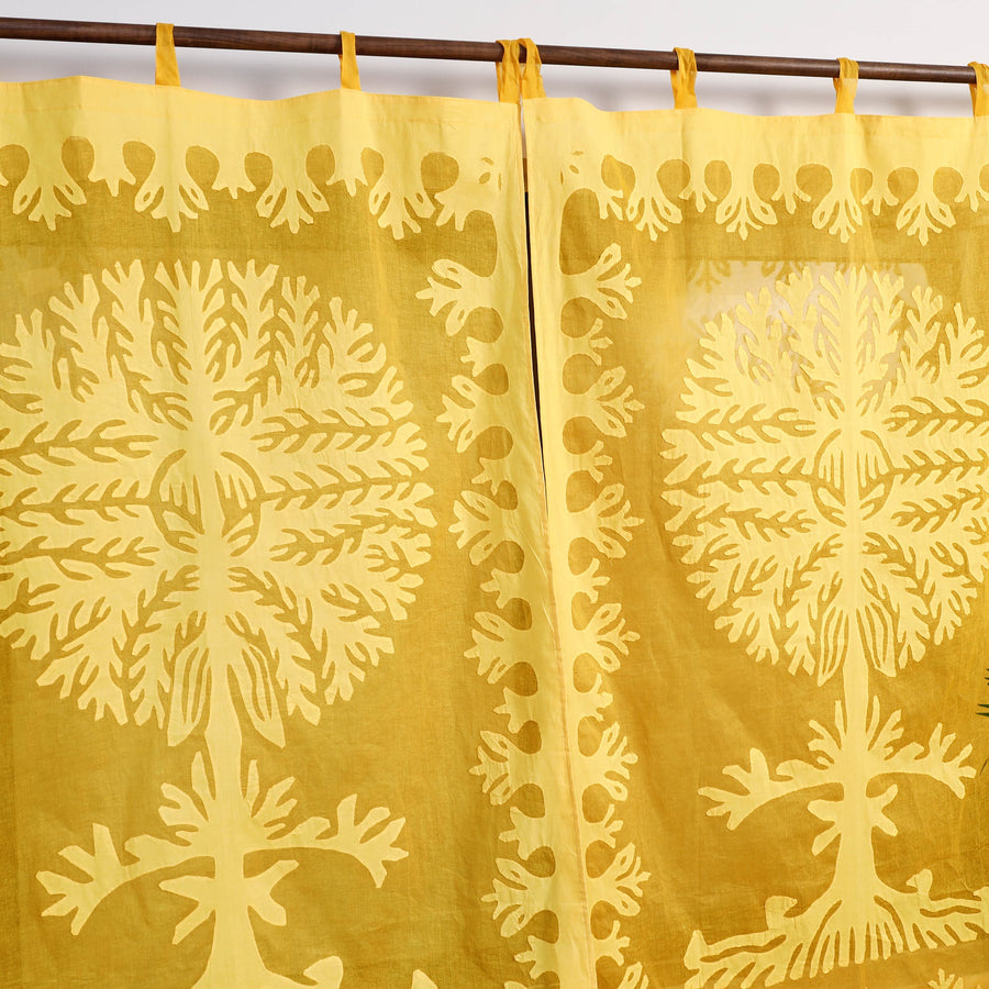 Fine quality yellow hand stitched traditional applique cutwork window curtain made from organdy cotton fabric. The applique cutwork window curtain from barmer is a stunning home decor piece that adds elegance to any space. Its unique style appliqué work does magic in light and shade with beautiful stories and patterns. it diffuses soft, natural light while providing privacy. This curtain serves as a stylish window treatment, enhancing the ambiance of your room with its exquisite craftsmanship and timeless appeal.