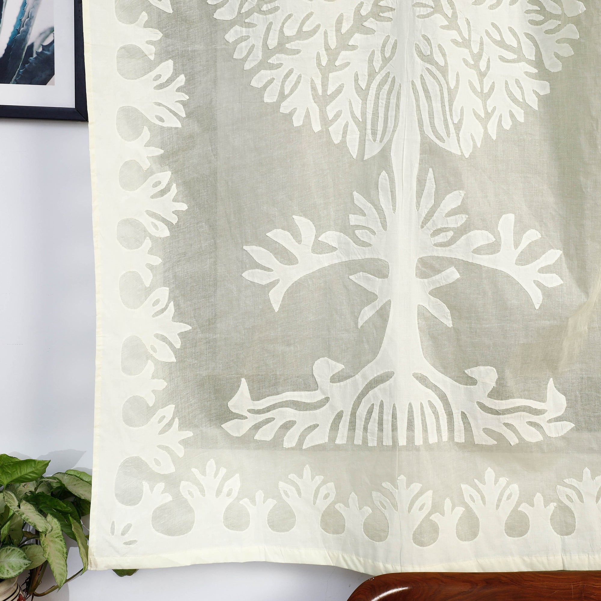 Fine quality off white hand stitched traditional applique cutwork window curtain made from organdy cotton fabric. The applique cutwork window curtain from barmer is a stunning home decor piece that adds elegance to any space. Its unique style appliqué work does magic in light and shade with beautiful stories and patterns. it diffuses soft, natural light while providing privacy. This curtain serves as a stylish window treatment, enhancing the ambiance of your room with its exquisite craftsmanship and timeless appeal.
