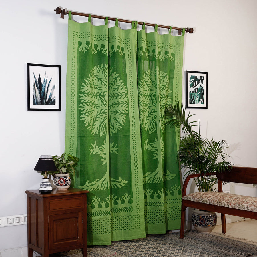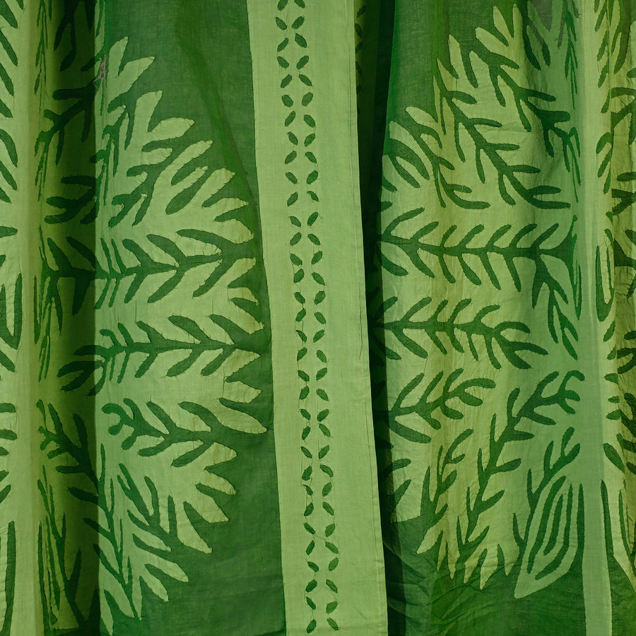 Fine quality green hand stitched traditional applique cutwork door curtain made from organdy cotton fabric. The applique cutwork door curtain from barmer is a stunning home decor piece that adds elegance to any space. Its unique style appliqué work does magic in light and shade with beautiful stories and patterns. It diffuses soft, natural light while providing privacy. This curtain serves as a stylish door treatment, enhancing the ambiance of your room with its exquisite craftsmanship and timeless appeal.