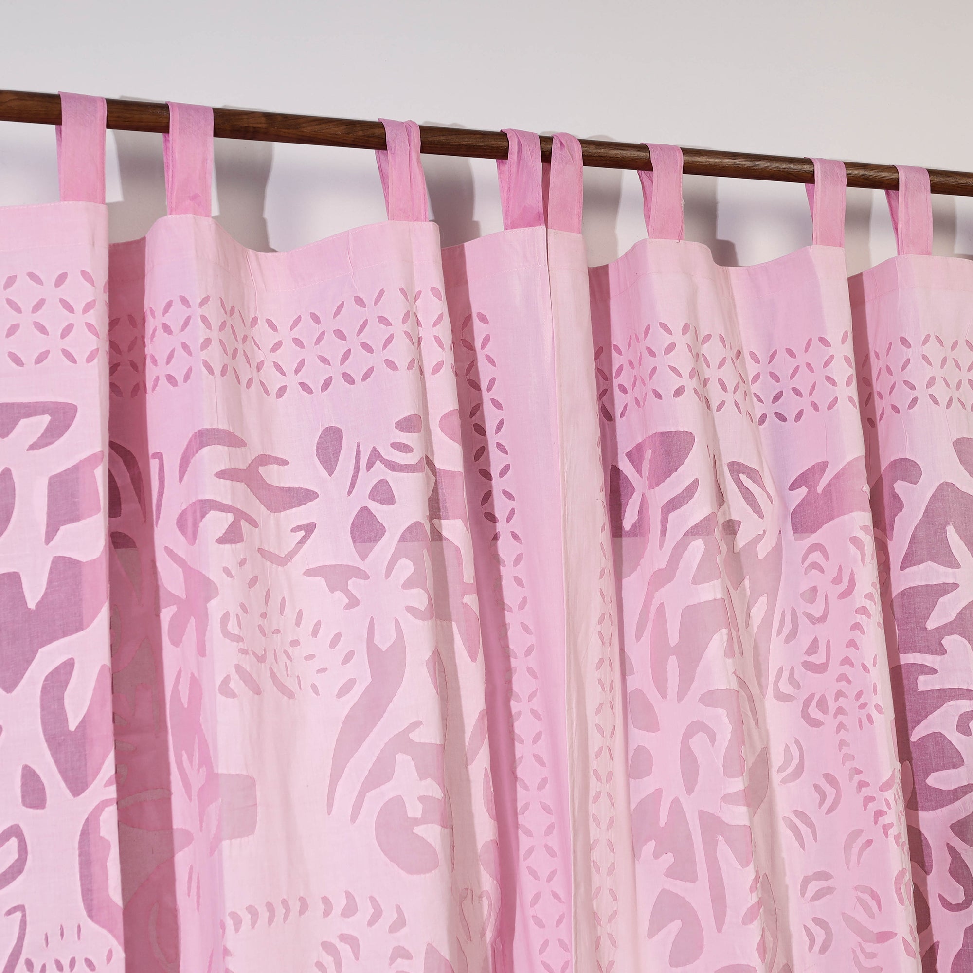 Fine quality pink hand stitched traditional applique cutwork door curtain made from organdy cotton fabric. The applique cutwork door curtain from barmer is a stunning home decor piece that adds elegance to any space. Its unique style appliqué work does magic in light and shade with beautiful stories and patterns. It diffuses soft, natural light while providing privacy. This curtain serves as a stylish door treatment, enhancing the ambiance of your room with its exquisite craftsmanship and timeless appeal.