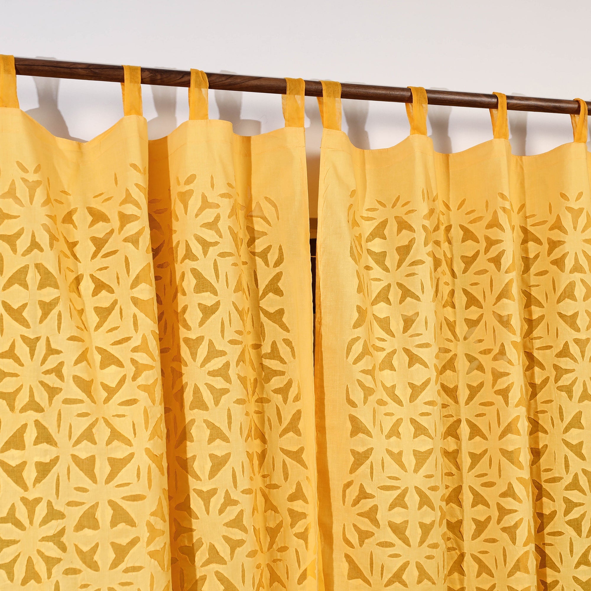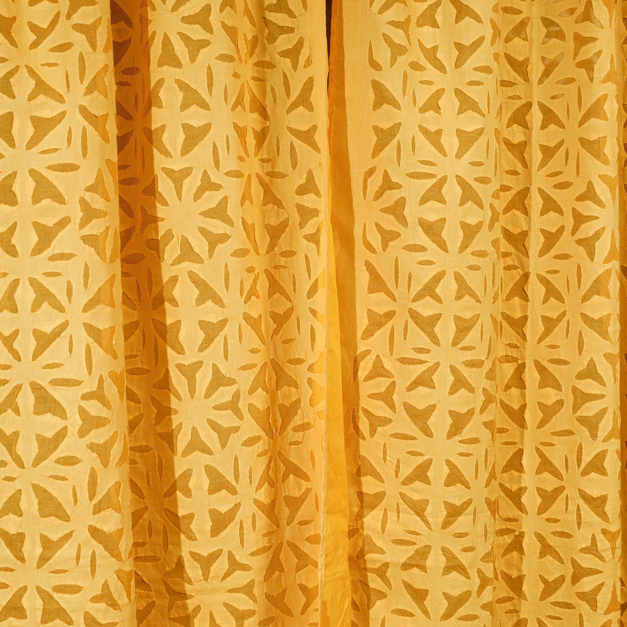 Fine quality yellow hand stitched traditional applique cutwork door curtain made from organdy cotton fabric. The applique cutwork door curtain from barmer is a stunning home decor piece that adds elegance to any space. Its unique style appliqué work does magic in light and shade with beautiful stories and patterns. It diffuses soft, natural light while providing privacy. This curtain serves as a stylish door treatment, enhancing the ambiance of your room with its exquisite craftsmanship and timeless appeal.