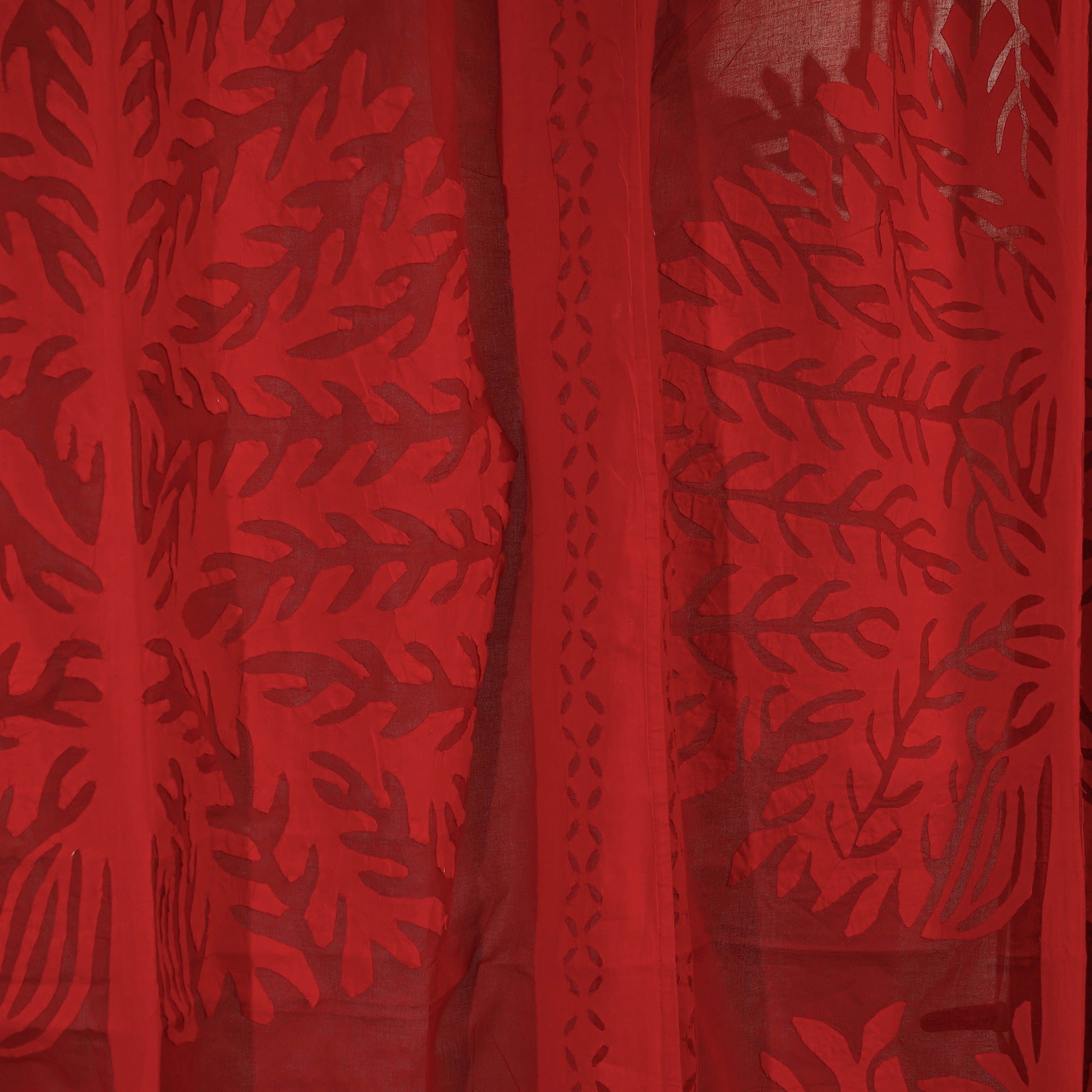 Fine quality red hand stitched traditional applique cutwork door curtain made from organdy cotton fabric. The applique cutwork door curtain from barmer is a stunning home decor piece that adds elegance to any space. Its unique style appliqué work does magic in light and shade with beautiful stories and patterns. It diffuses soft, natural light while providing privacy. This curtain serves as a stylish door treatment, enhancing the ambiance of your room with its exquisite craftsmanship and timeless appeal.