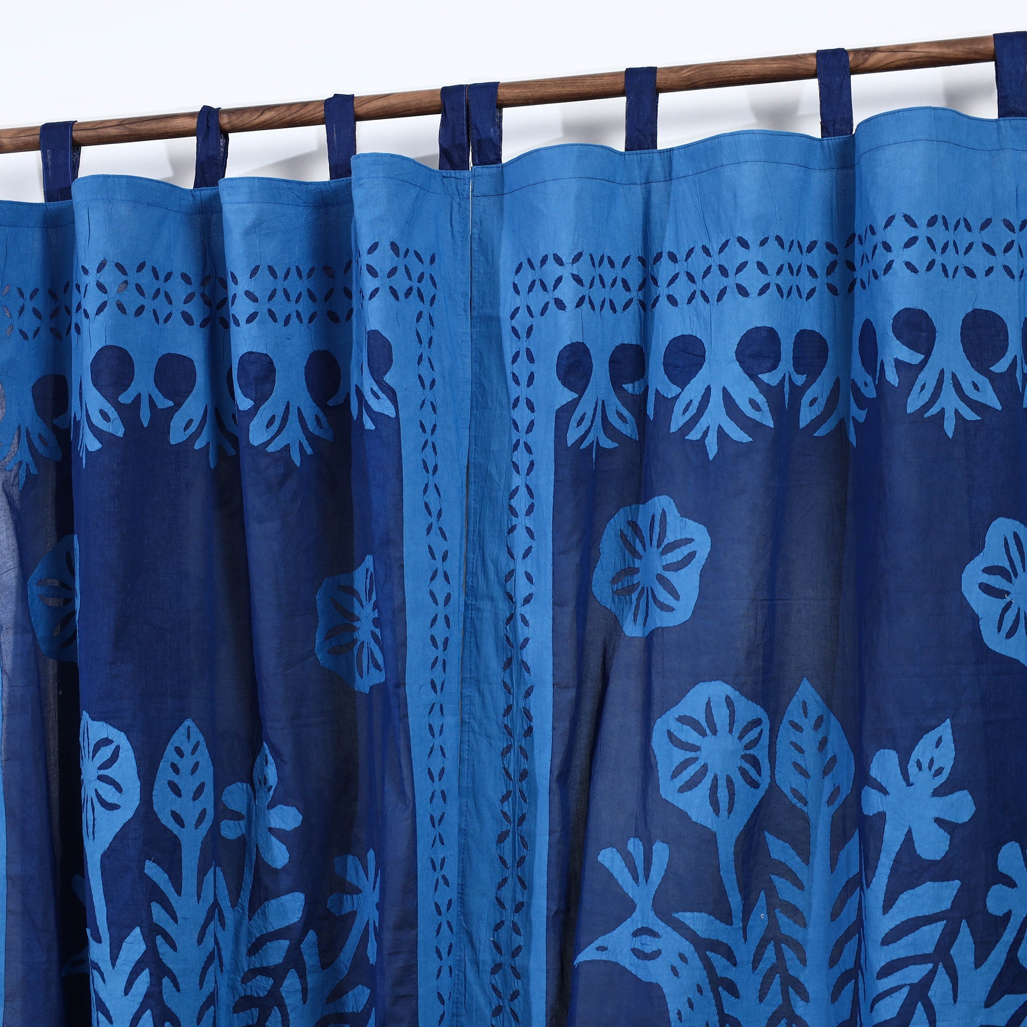 Fine-quality blue hand-stitched traditional applique cutwork door curtain made from organdy cotton fabric. The applique cutwork door curtain from Barmer is a stunning home decor piece that adds elegance to any space. Its unique style of appliqué work does magic in light and shade with beautiful stories and patterns. It diffuses soft, natural light while providing privacy. This curtain serves as a stylish door treatment, enhancing the ambiance of your room with its exquisite craftsmanship and timeless appeal.