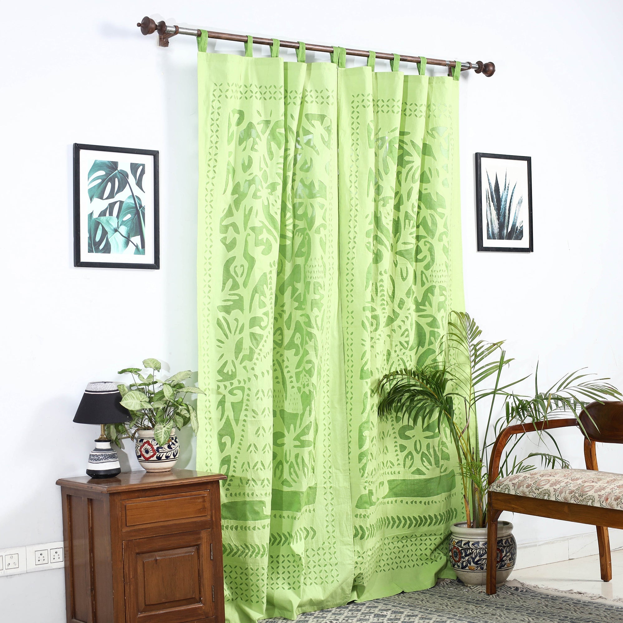 Fine-quality green hand-stitched traditional applique cutwork door curtain made from organdy cotton fabric. The applique cutwork door curtain from Barmer is a stunning home decor piece that adds elegance to any space. Its unique style of appliqué work does magic in light and shade with beautiful stories and patterns. It diffuses soft, natural light while providing privacy. This curtain serves as a stylish door treatment, enhancing the ambiance of your room with its exquisite craftsmanship and timeless appeal.
