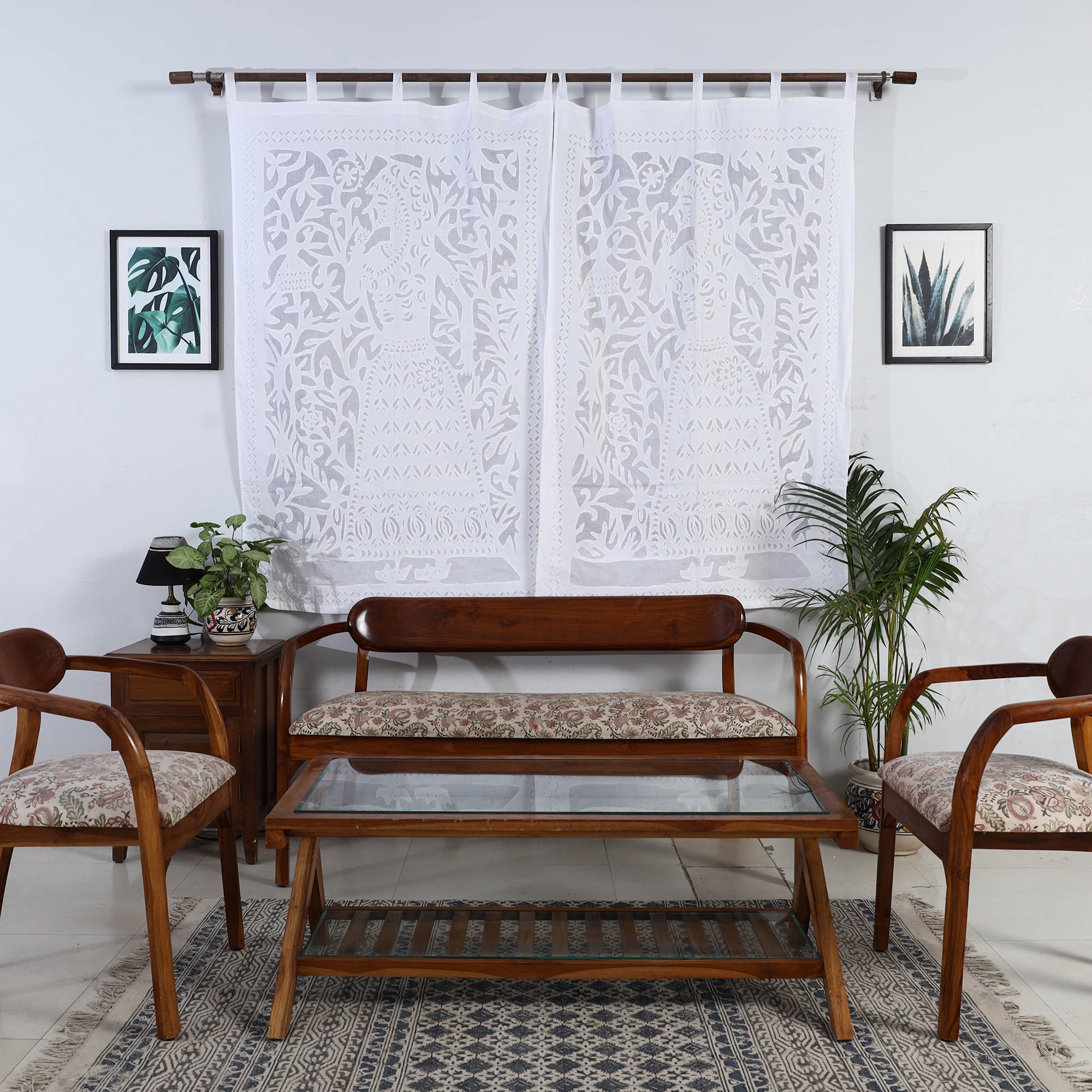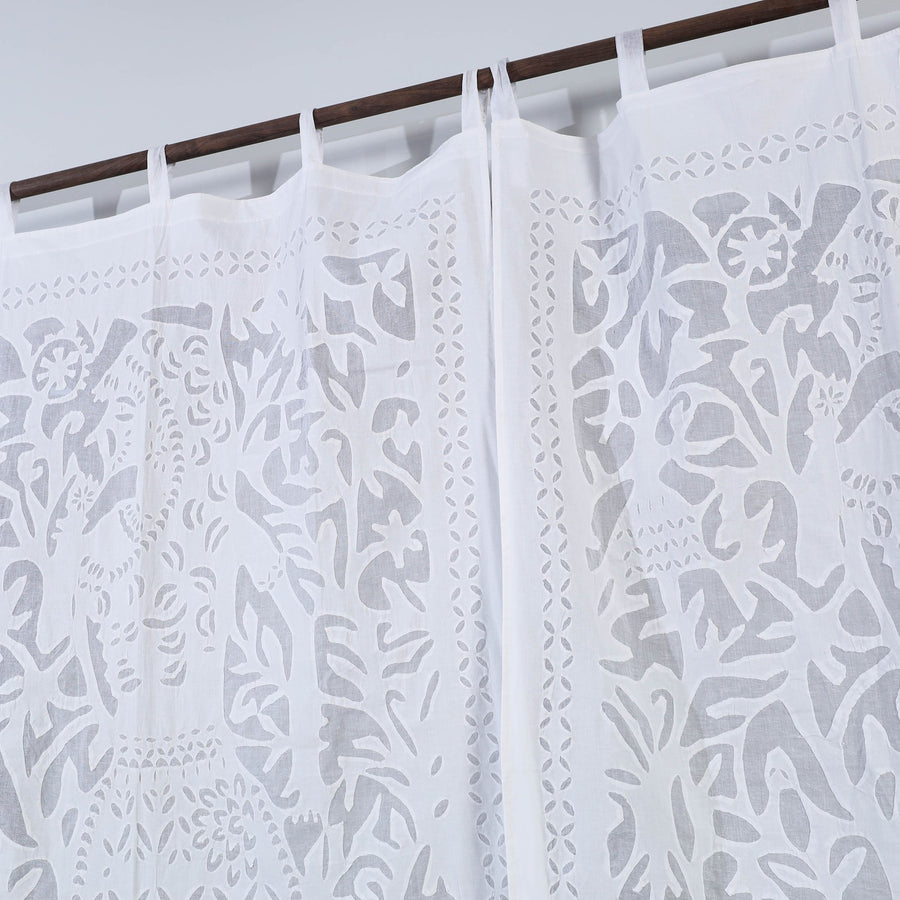 Fine-quality white hand-stitched traditional applique cutwork window curtain made from organdy cotton fabric. The applique cutwork window curtain from Barmer is a stunning home decor piece that adds elegance to any space. Its unique style of appliqué work does magic in light and shade with beautiful stories and patterns. It diffuses soft, natural light while providing privacy. This curtain serves as a stylish window treatment, enhancing the ambiance of your room with its exquisite craftsmanship and timeless appeal.