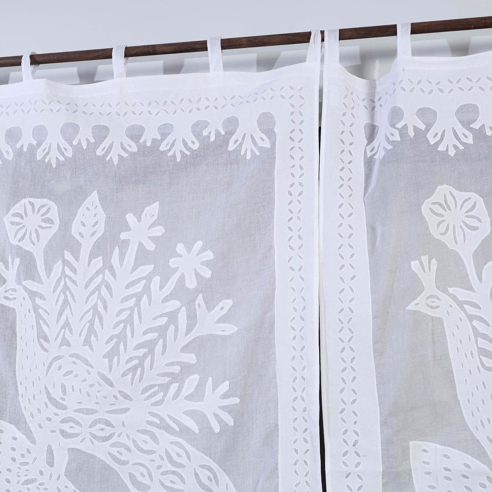 Fine-quality hand-stitched traditional white applique cutwork window curtain made from organdy cotton fabric. The applique cutwork window curtain from Barmer is a stunning home decor piece that adds elegance to any space. Its unique style of appliqué work does magic in light and shade with beautiful stories and patterns. It diffuses soft, natural light while providing privacy. This curtain serves as a stylish window treatment, enhancing the ambiance of your room with its exquisite craftsmanship and timeless appeal.