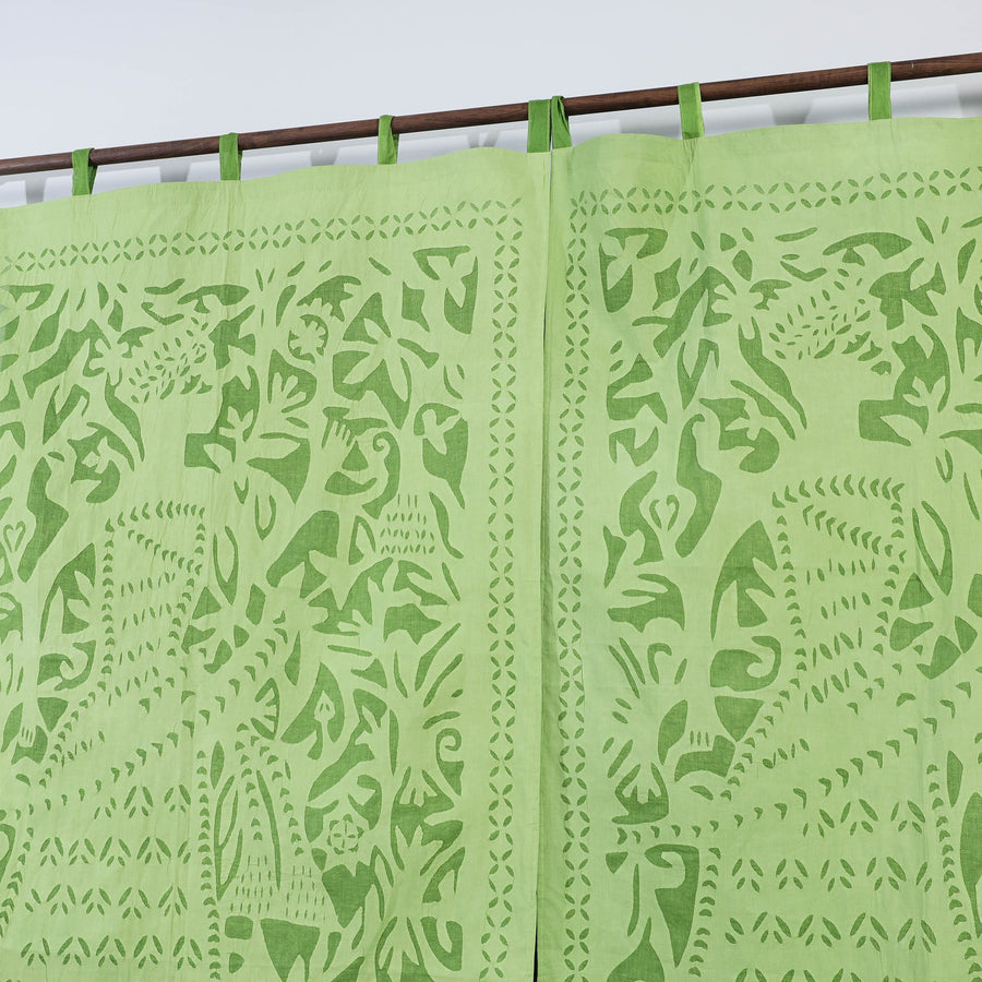 Fine-quality green hand-stitched traditional applique cutwork window curtain made from organdy cotton fabric. The applique cutwork window curtain from Barmer is a stunning home decor piece that adds elegance to any space. Its unique style of appliqué work does magic in light and shade with beautiful stories and patterns. It diffuses soft, natural light while providing privacy. This curtain serves as a stylish window treatment, enhancing the ambiance of your room with its exquisite craftsmanship and timeless appeal.