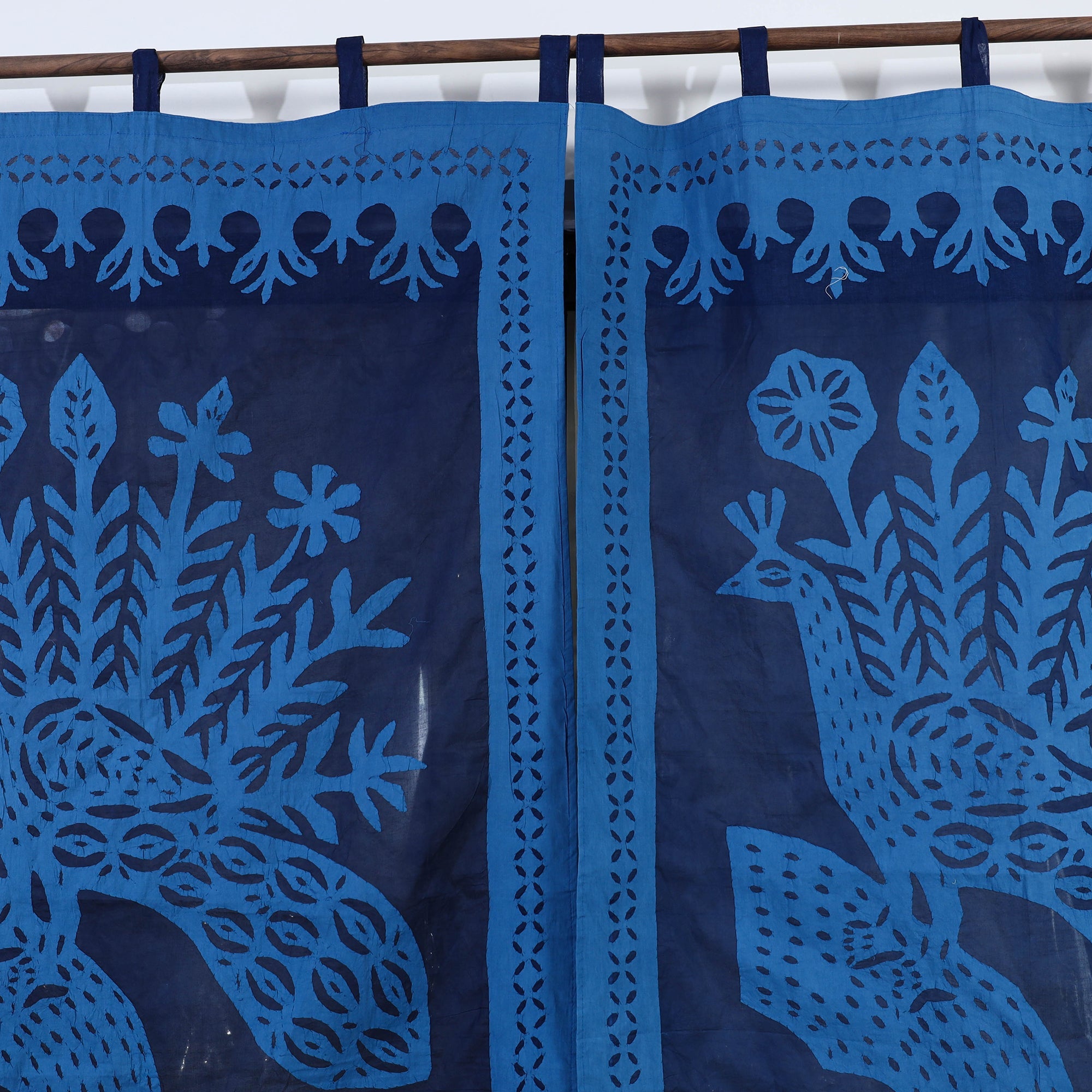Fine-quality blue hand-stitched traditional applique cutwork window curtain made from organdy cotton fabric. The applique cutwork window curtain from Barmer is a stunning home decor piece that adds elegance to any space. Its unique style of appliqué work does magic in light and shade with beautiful stories and patterns. It diffuses soft, natural light while providing privacy. This curtain serves as a stylish window treatment, enhancing the ambiance of your room with its exquisite craftsmanship and timeless appeal.