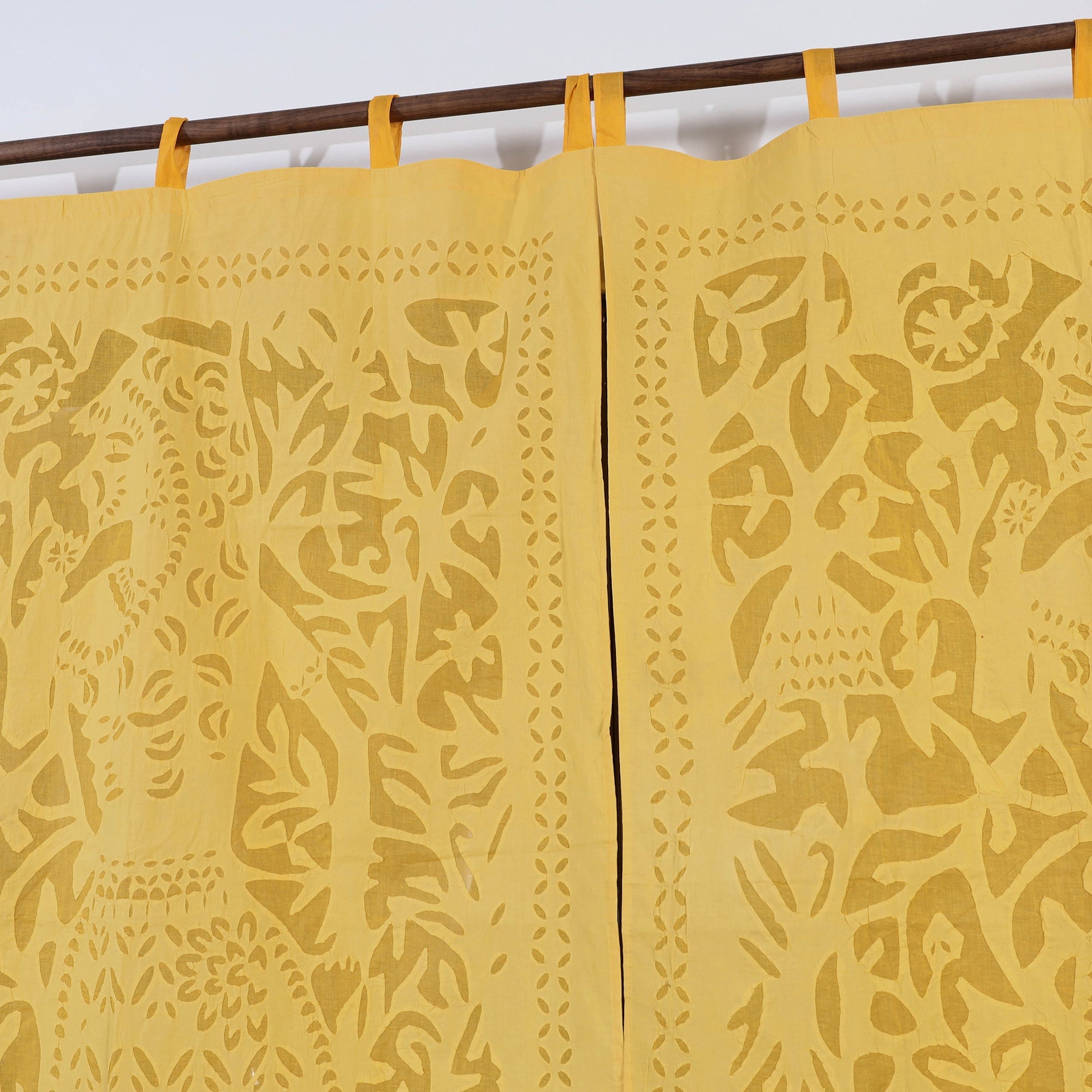 Fine-quality yellow hand-stitched traditional applique cutwork window curtain made from organdy cotton fabric. The applique cutwork window curtain from Barmer is a stunning home decor piece that adds elegance to any space. Its unique style of appliqué work does magic in light and shade with beautiful stories and patterns. It diffuses soft, natural light while providing privacy. This curtain serves as a stylish window treatment, enhancing the ambiance of your room with its exquisite craftsmanship and timeless appeal.