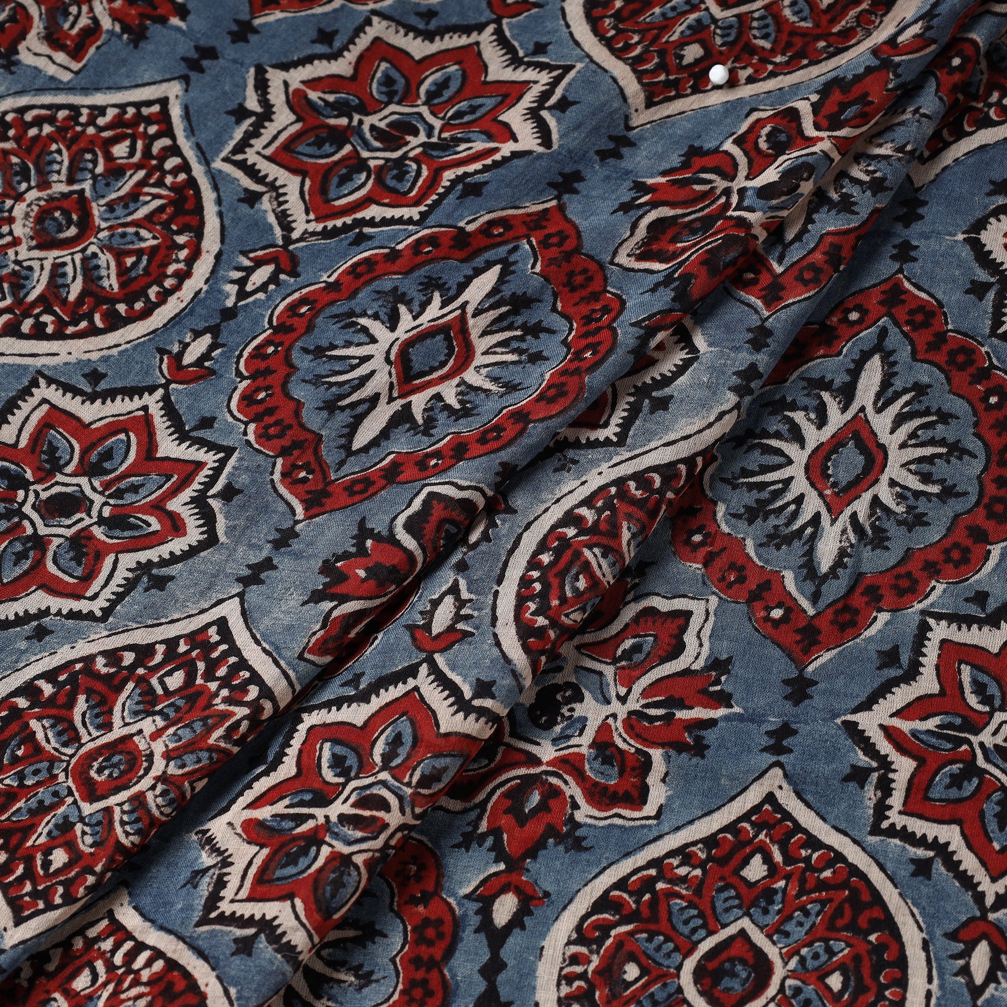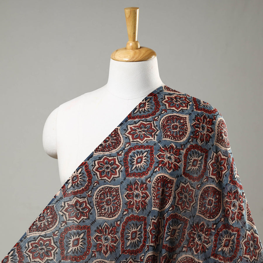 Experience this fine quality blue ajrakh block printing mul cotton fabric, made using natural dyes and traditional hand-block printing techniques by skilled artisans Abdul Rauph Khatri practised in the Kutch region of Gujarat. This traditional technique of vegetable dyeing and resist block-printing on cloth dates back 4,500 years and is the attire of the Maldhari pastoral community of Bhuj. With each layer of colour printed after a gap of time, this fabric requires a lot of time and care. Perfect for those who appreciate traditional craftsmanship and eco-friendly products.