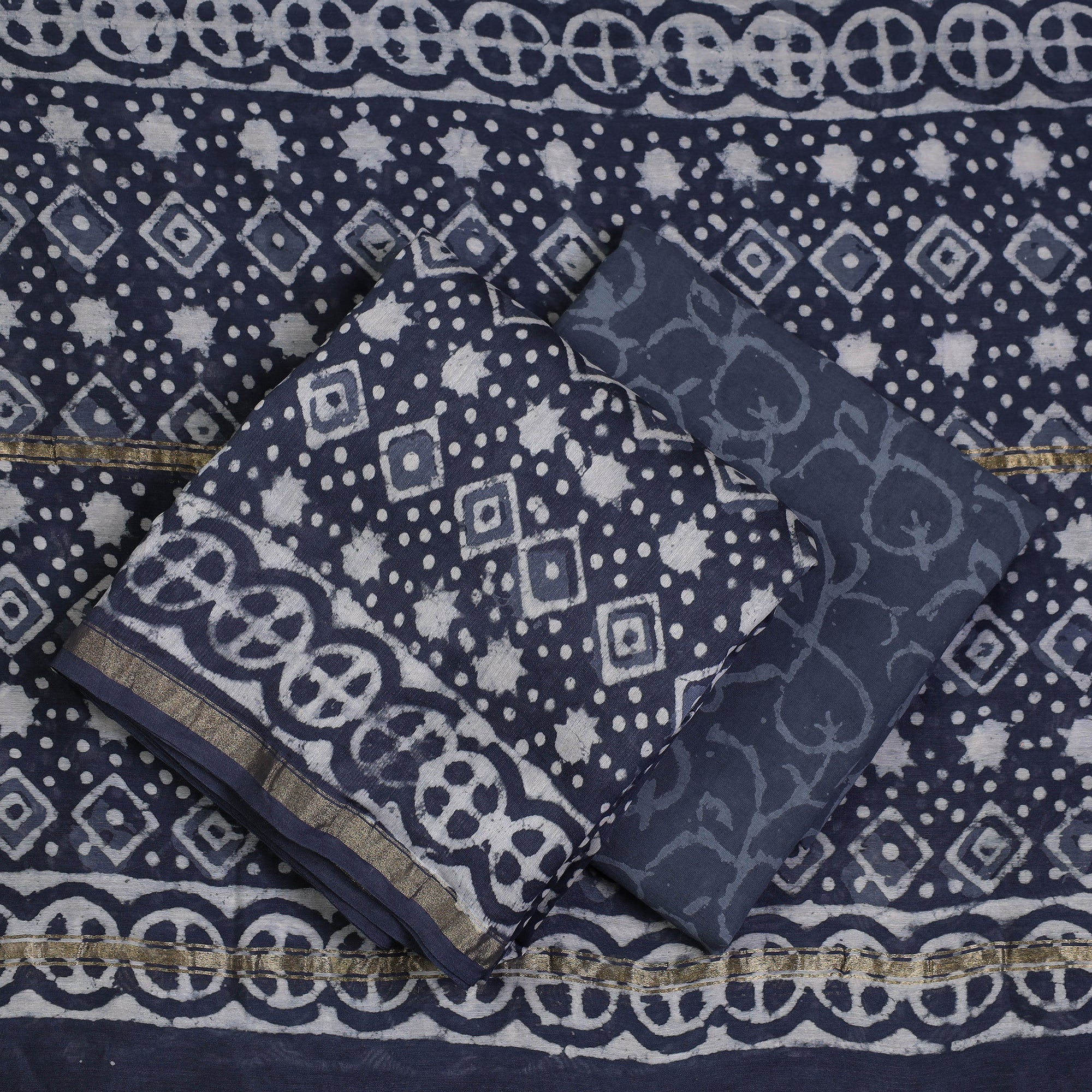 Experience the rich tradition of bagru dabu with this fine quality blue chanderi silk zari border kurta material & dupatta with cotton bottom material. Crafted with care using natural dyes and traditional mud resist process, this fine quality fabric features intricate designs made with hand carved wooden blocks. Paired with a mul cotton dupatta, this suit material is perfect for those who appreciate the beauty of craftsmanship and traditional Indian textiles. Made in Bagru, Rajasthan, it's a timeless piece that adds a touch of elegance to your wardrobe.