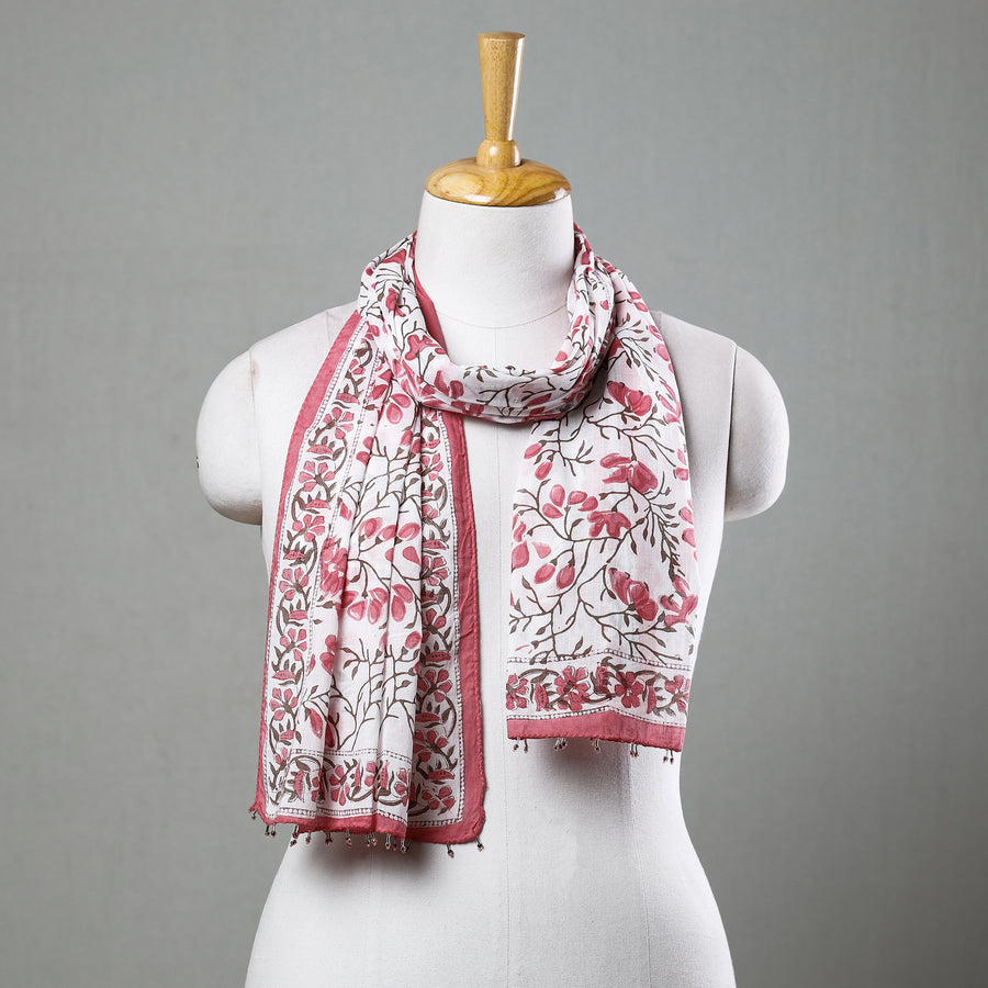 Experience the rich heritage of Rajasthan with our Sanganeri hand block printed cotton stole with beaded border. The bleed-free VAT dyes ensure lasting vibrancy. The elaborate detailing of the flowers and petals showcases the artistry of this hand-block printing technique originating from Sanganer, Rajasthan. Embrace timeless elegance and support artisanal craftsmanship with this unique accessory.