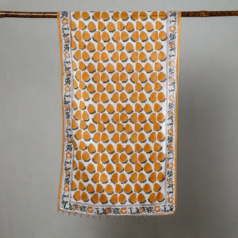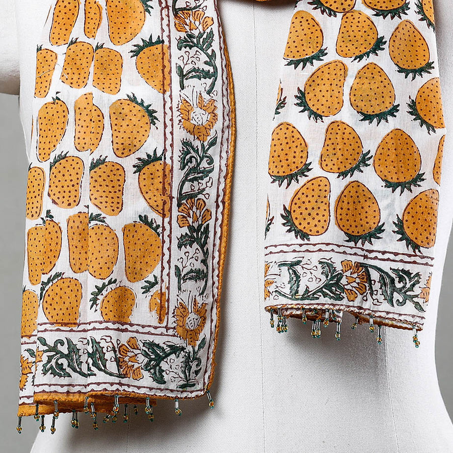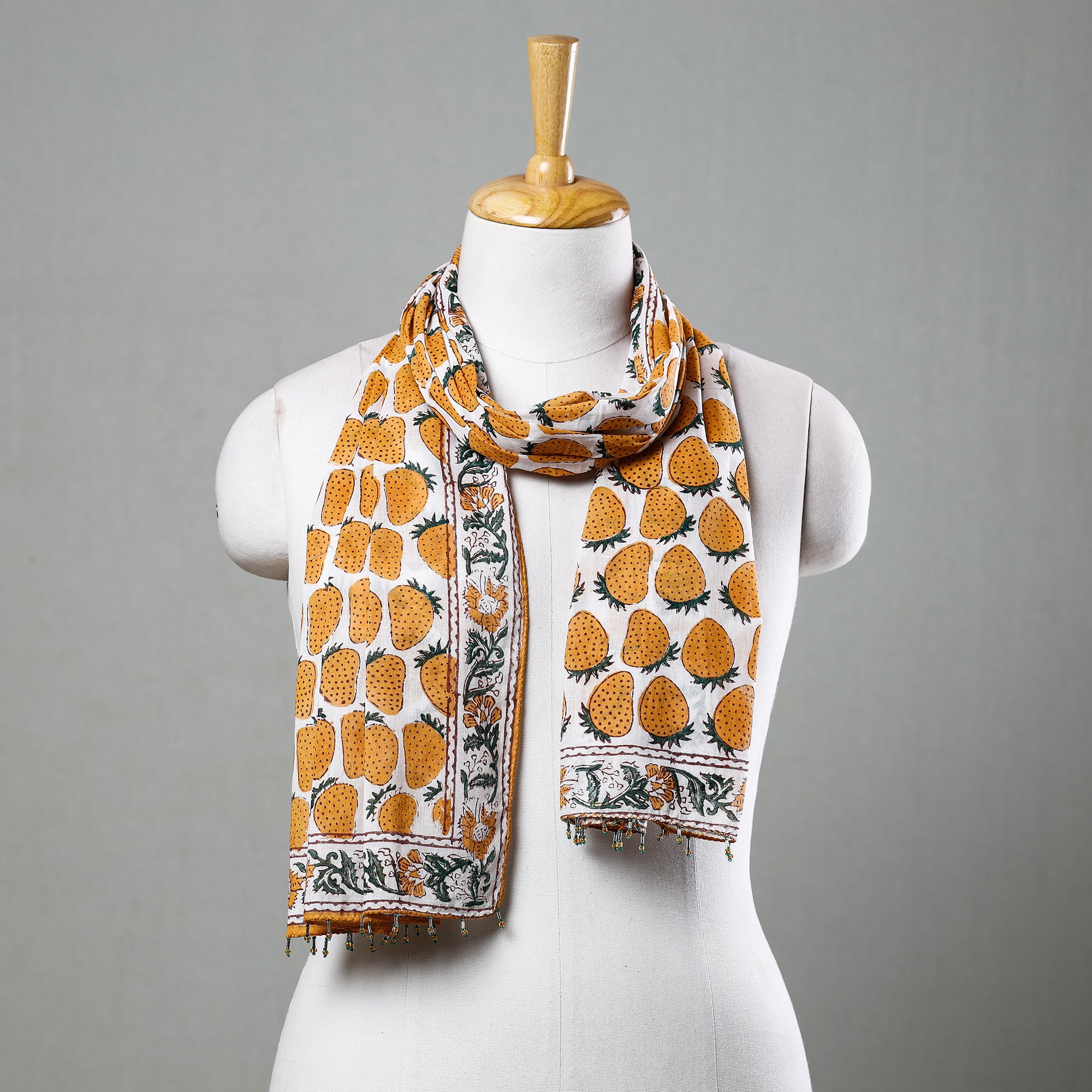 Experience the rich heritage of Rajasthan with our Sanganeri hand block printed cotton stole with beaded border. The bleed-free VAT dyes ensure lasting vibrancy. The elaborate detailing of the flowers and petals showcases the artistry of this hand-block printing technique originating from Sanganer, Rajasthan. Embrace timeless elegance and support artisanal craftsmanship with this unique accessory.