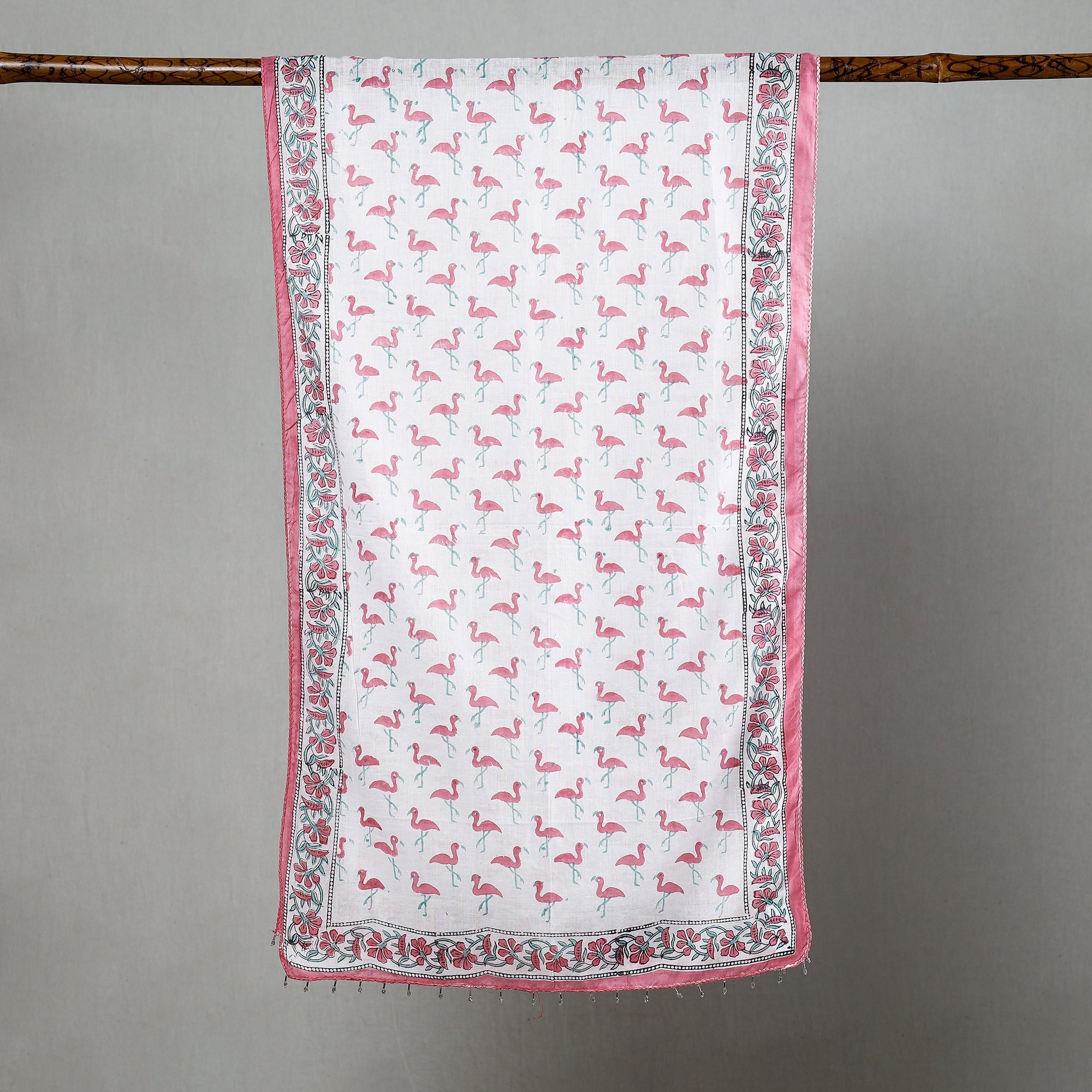 Experience the rich heritage of Rajasthan with our Sanganeri hand block printed cotton stole with beaded border. The bleed-free VAT dyes ensure lasting vibrancy. The elaborate detailing of the flowers and petals showcases the artistry of this hand-block printing technique originating from Sanganer, Rajasthan. Embrace timeless elegance and support artisanal craftsmanship with this unique accessory.