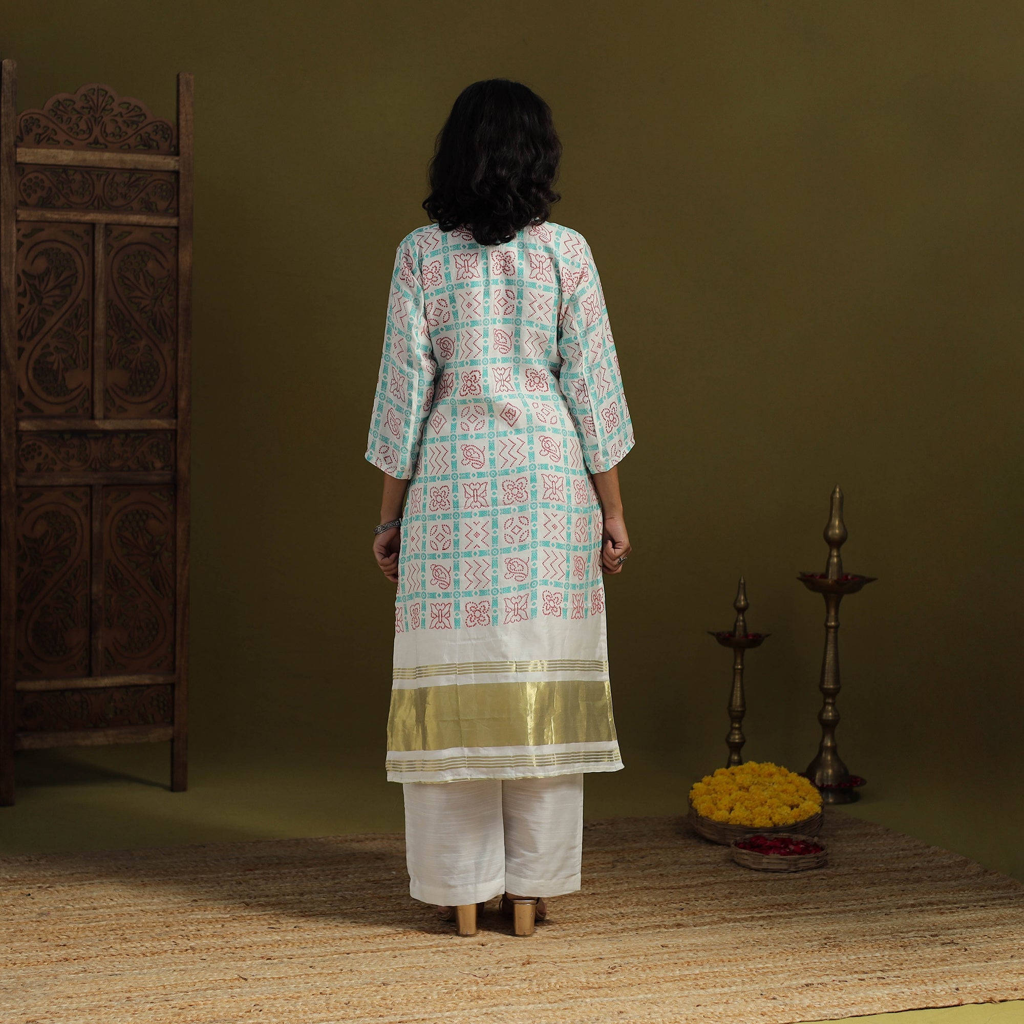| Material | Elevate your style with this exquisite white bandhani kurta set that blends comfort with elegance. Made from art silk, the kurta showcases traditional bandhani patterns enhanced by a graceful lagdi patta detail and a handy side pocket. It is paired with a plain slub silk palazzo, designed with an elasticated waist and two side pockets for everyday ease. Perfect for festive gatherings or special occasions, this set adds refined charm while ensuring all-day comfort. |