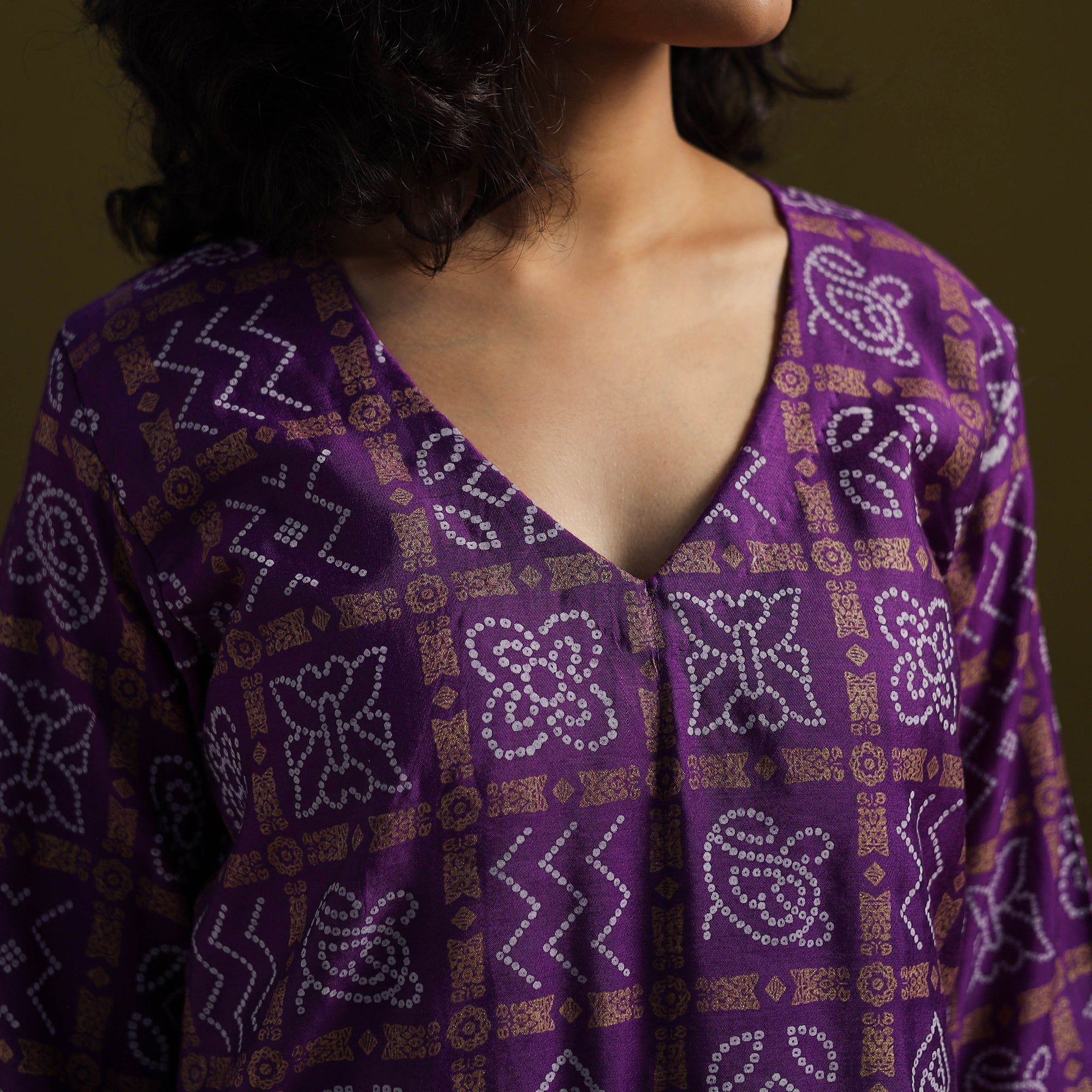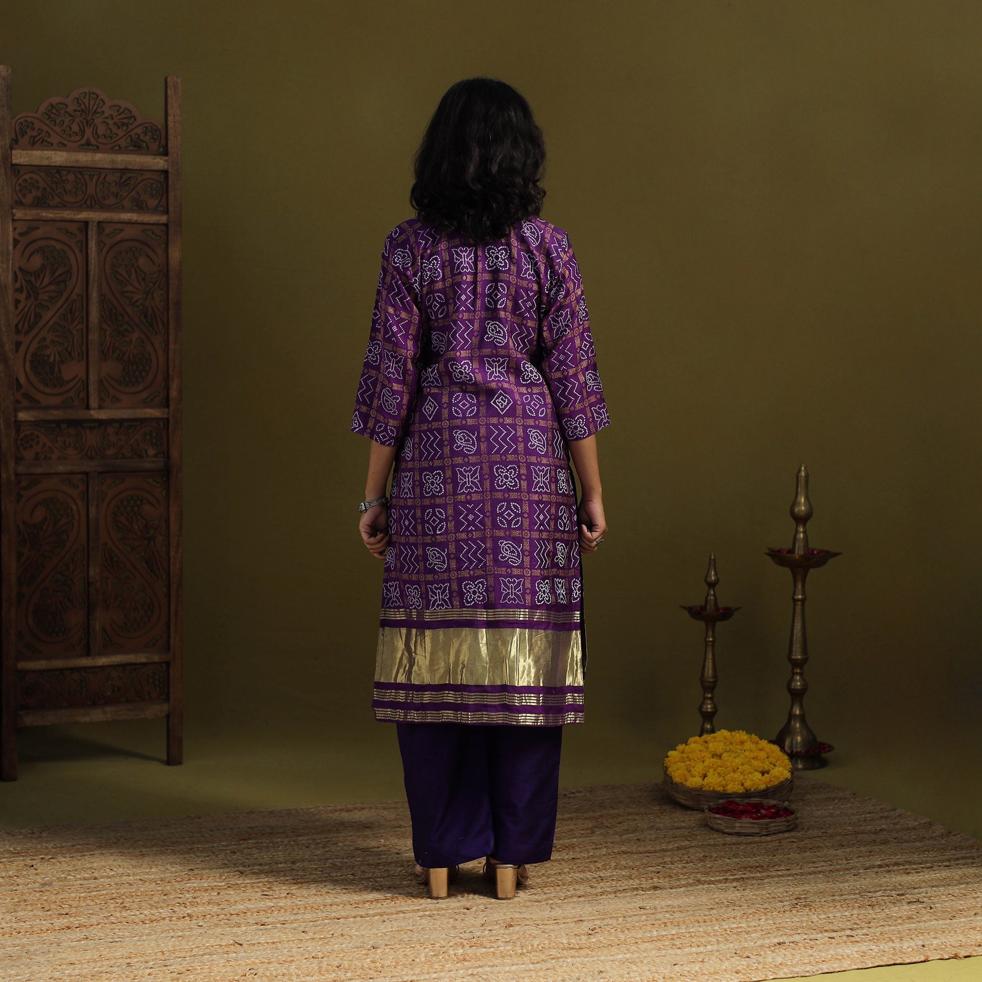 Elevate your style with this exquisite purple bandhani kurta set that blends comfort with elegance. Made from art silk, the kurta showcases traditional bandhani patterns enhanced by a graceful lagdi patta detail and a handy side pocket. It is paired with a plain slub silk palazzo, designed with an elasticated waist and two side pockets for everyday ease. Perfect for festive gatherings or special occasions, this set adds refined charm while ensuring all-day comfort.