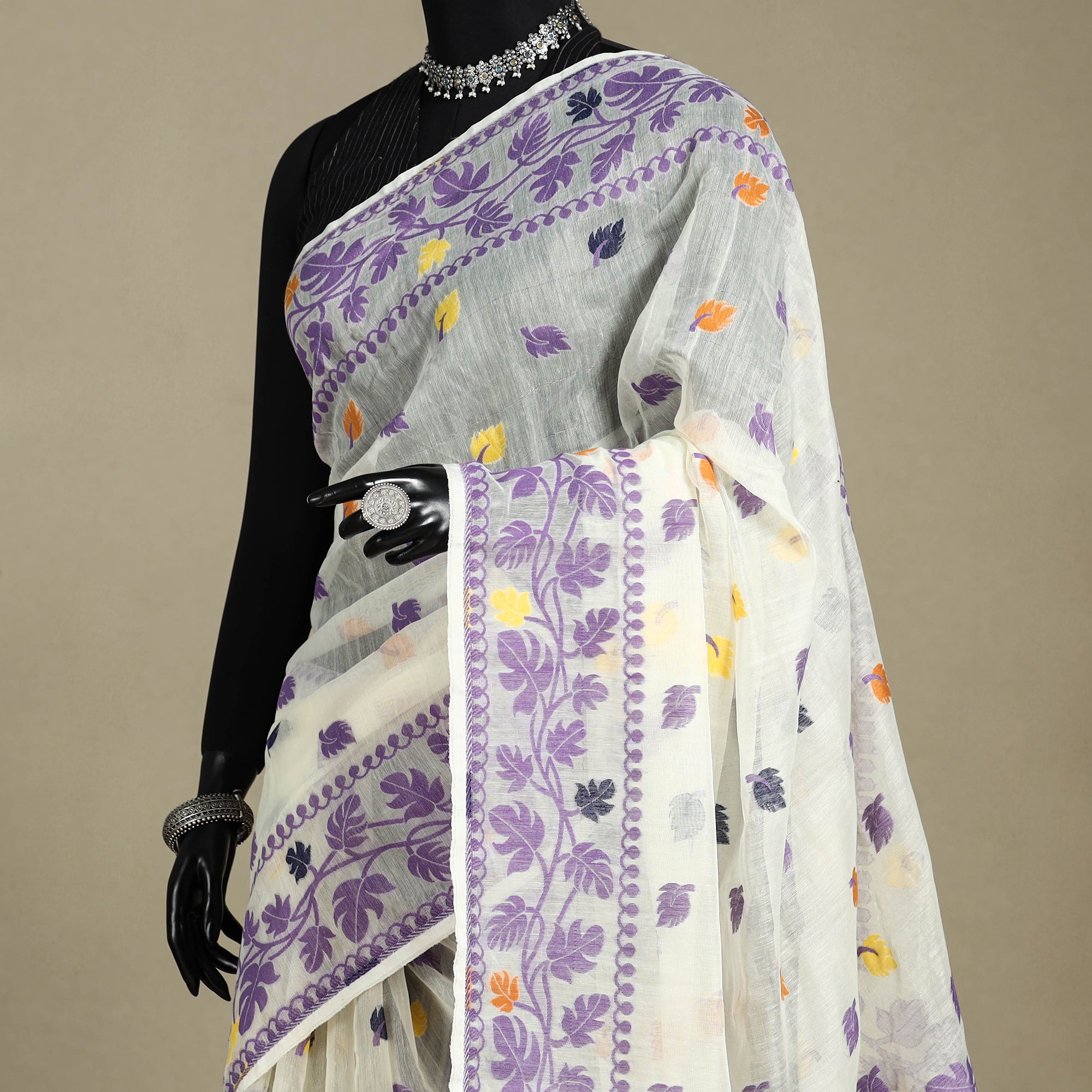 White dhakai jamdani saree is made of silk cotton using Bengal’s traditional extra-weft weaving technique. The motifs are woven directly into the fabric, giving the appearance of fine embroidery. It looks beautiful for festive celebrations, cultural gatherings, or elegant daily wear.