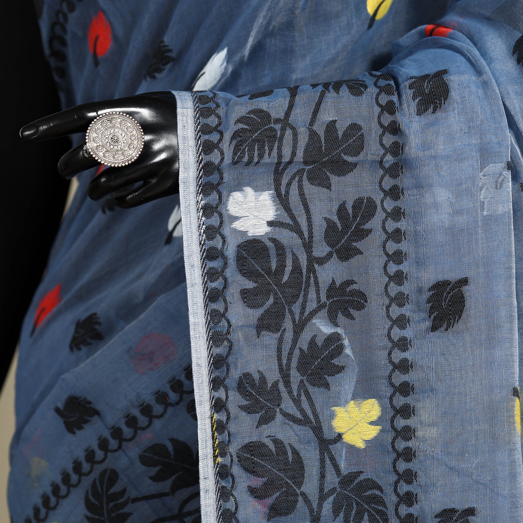 Blue dhakai jamdani saree is made of silk cotton using Bengal’s traditional extra-weft weaving technique. The motifs are woven directly into the fabric, giving the appearance of fine embroidery. It looks beautiful for festive celebrations, cultural gatherings, or elegant daily wear.