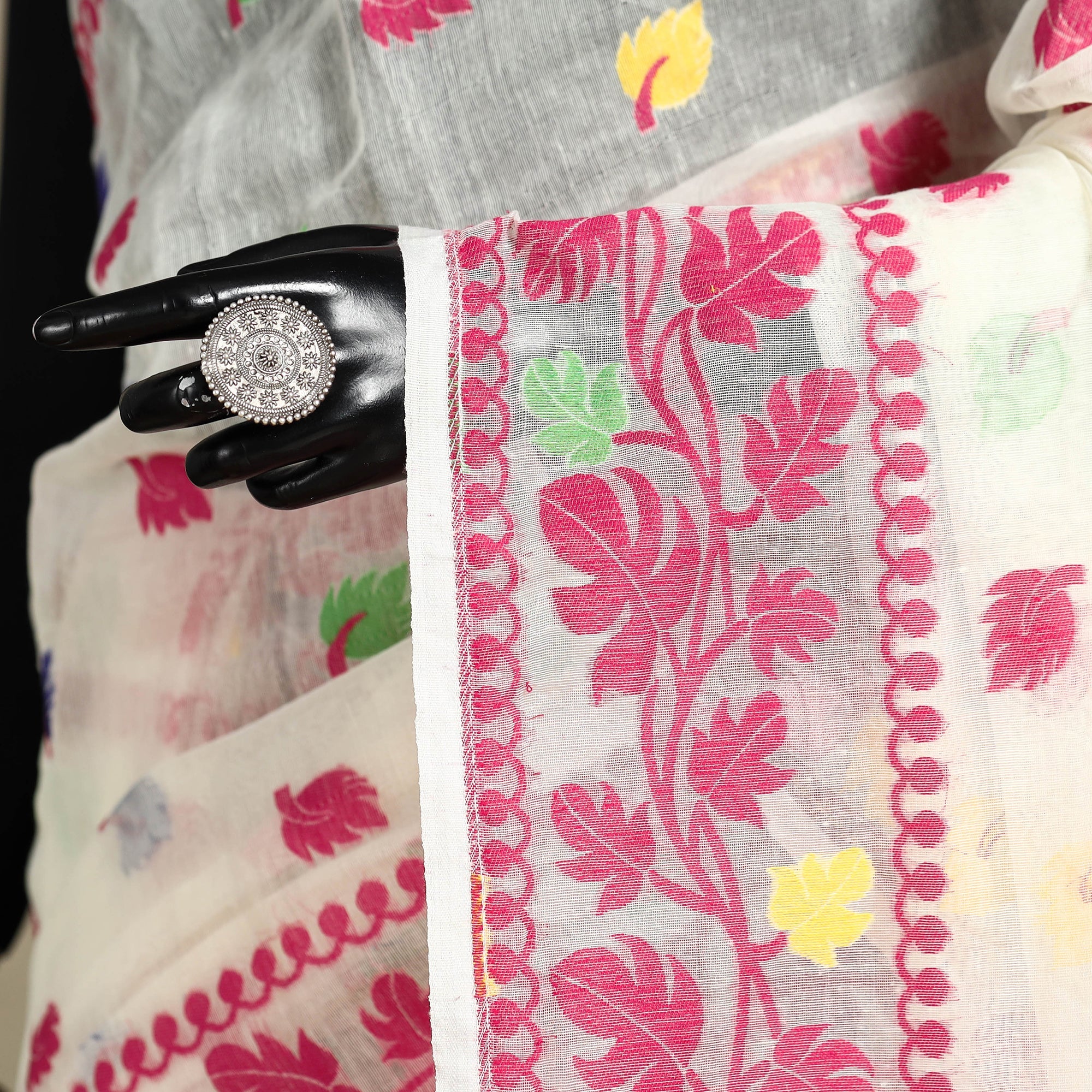 White dhakai jamdani saree is made of silk cotton using Bengal’s traditional extra-weft weaving technique. The motifs are woven directly into the fabric, giving the appearance of fine embroidery. It looks beautiful for festive celebrations, cultural gatherings, or elegant daily wear.