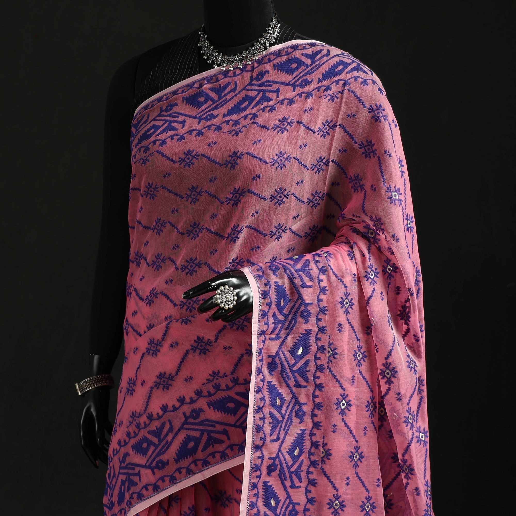 | Material | Pink dhakai jamdani saree is crafted from silk cotton blend using Bengal’s traditional extra-weft weaving technique. In this art form, delicate motifs are woven directly into the fabric instead of being printed or embroidered. Known for its lightweight texture and elegant appearance, the dhakai jamdani saree features beautiful floral and traditional designs. This saree is perfect for festive celebrations, cultural events, or graceful everyday wear. |