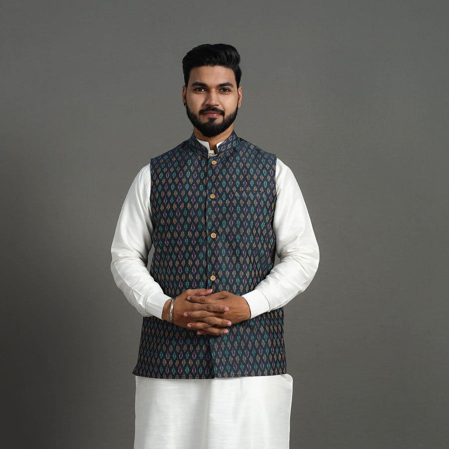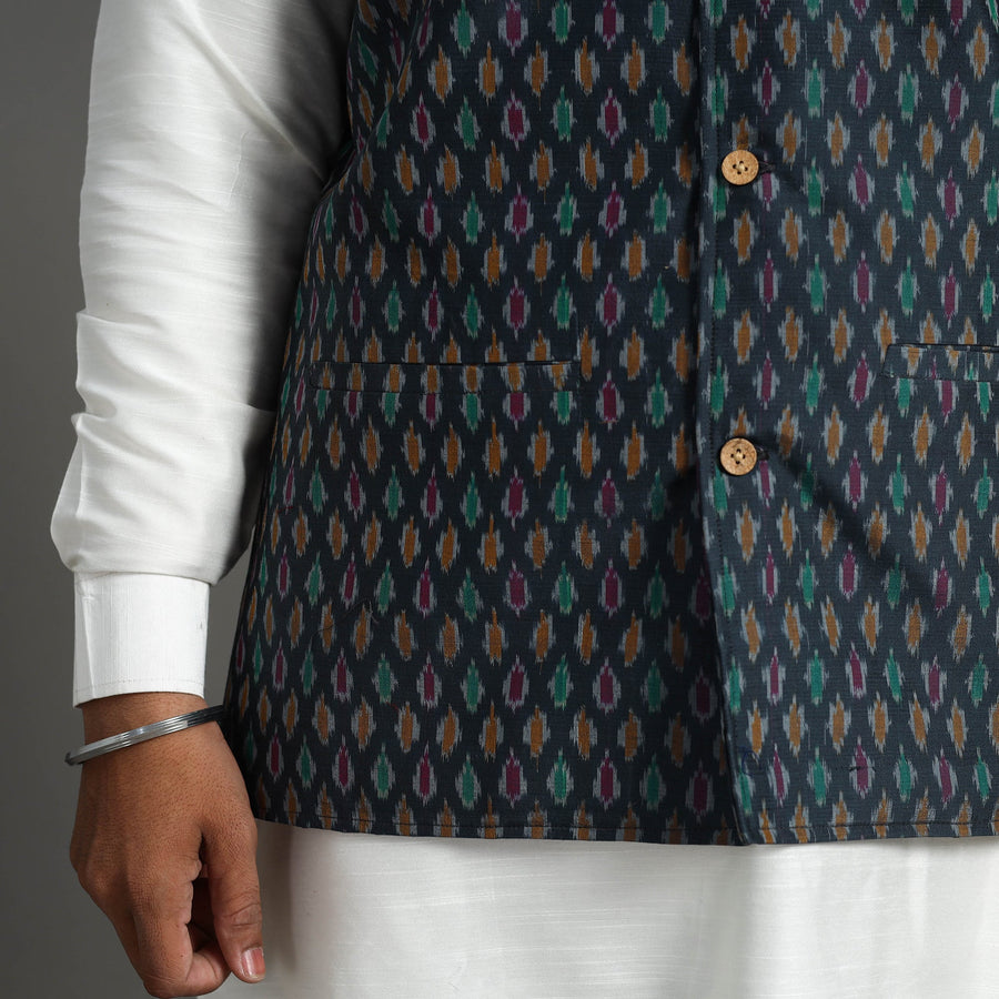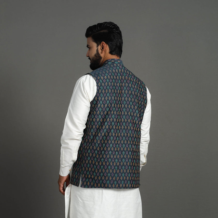 This silk cotton handwoven dark grey pochampally ikat nehru jacket for men combines tradition and practicality. Made from pure sico silk cotton, it features intricate Ikat patterns, a sleeveless design, a Chinese collar, and three functional outer pockets. Perfect for festive or casual occasions.