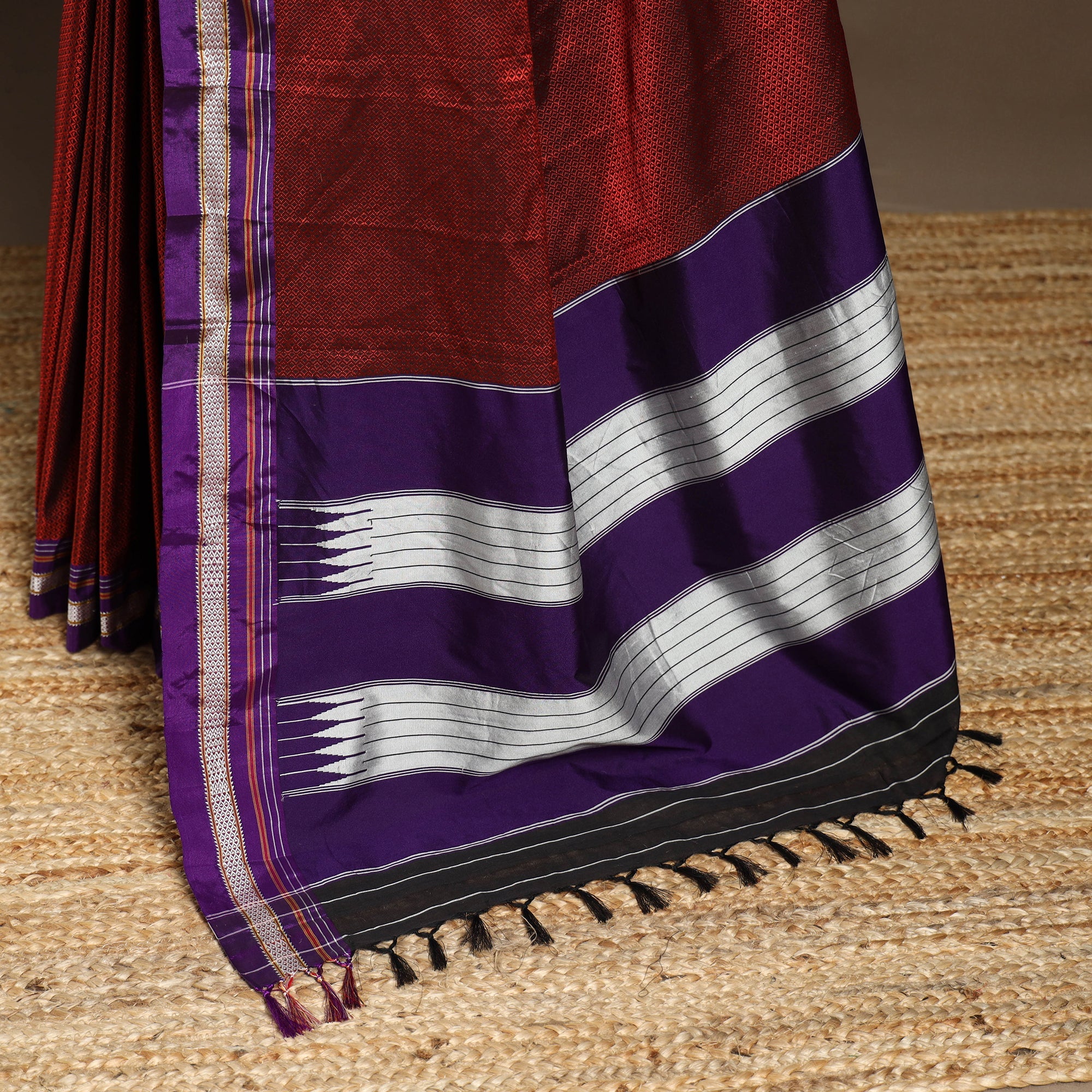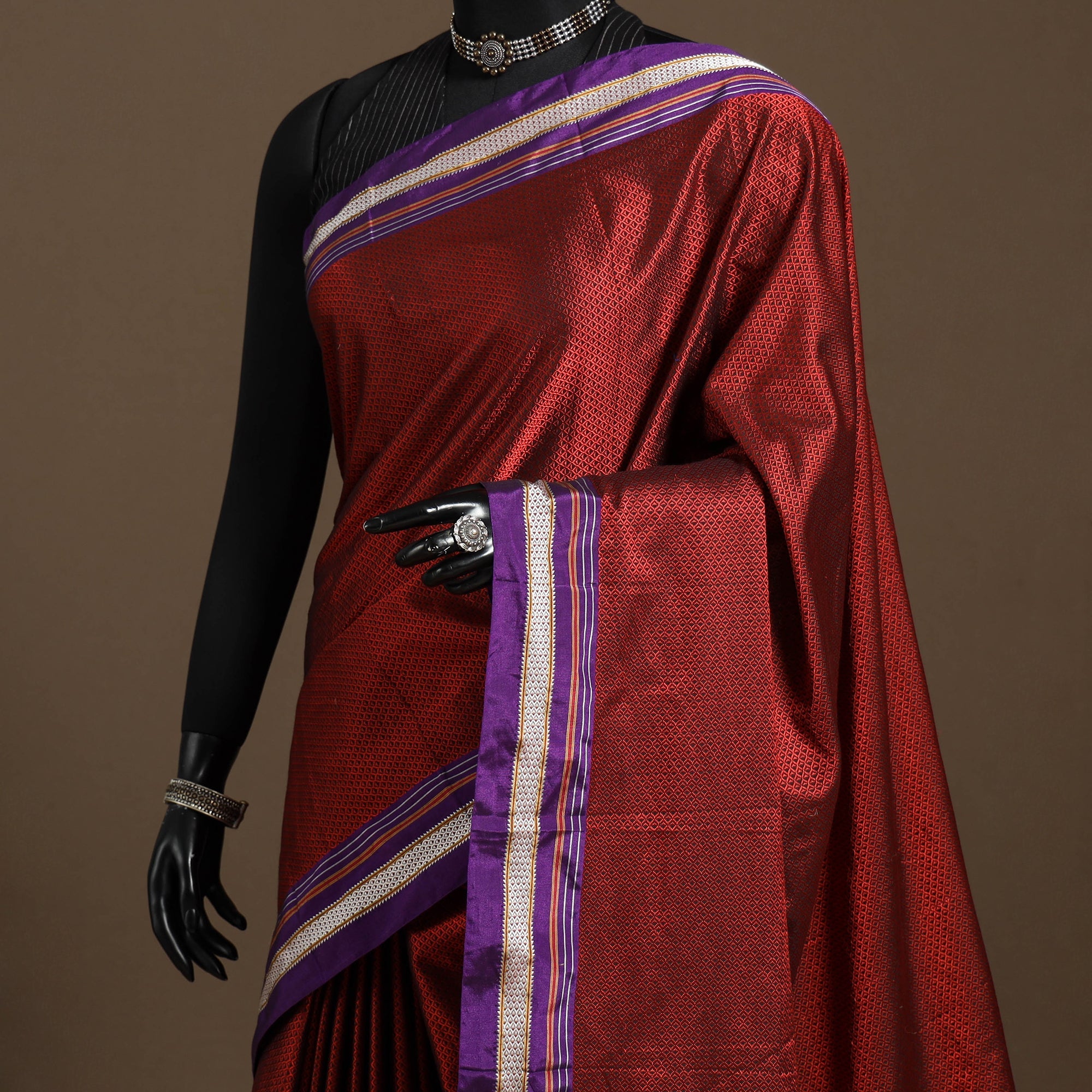 A real silk saree will have slight variations in texture uniformity, which are quite noticeable.