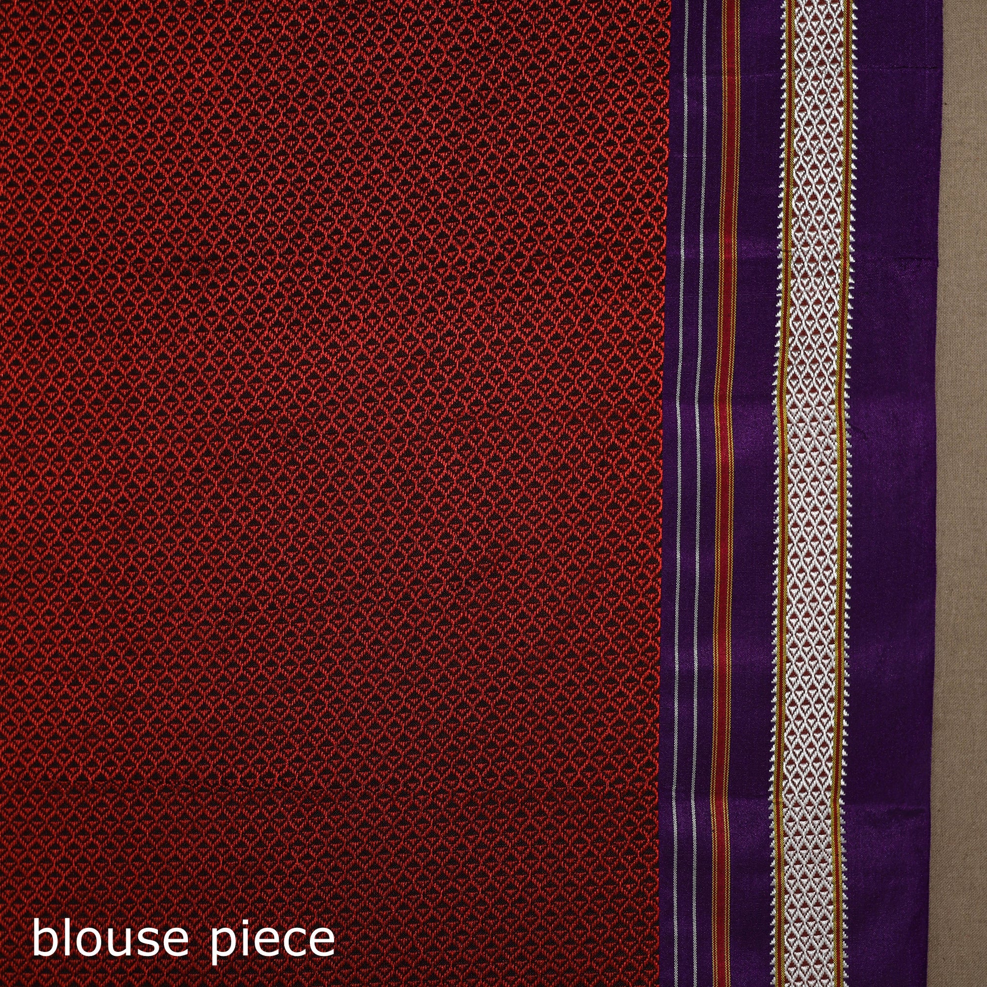 Khun is woven exclusively on a loom in Guledagudd, Bagalkot region, Karnataka. Used only for sari blouses, this handmade fabric is easily recognizable by its small white intricate motif and distinctive reddish-purple border.