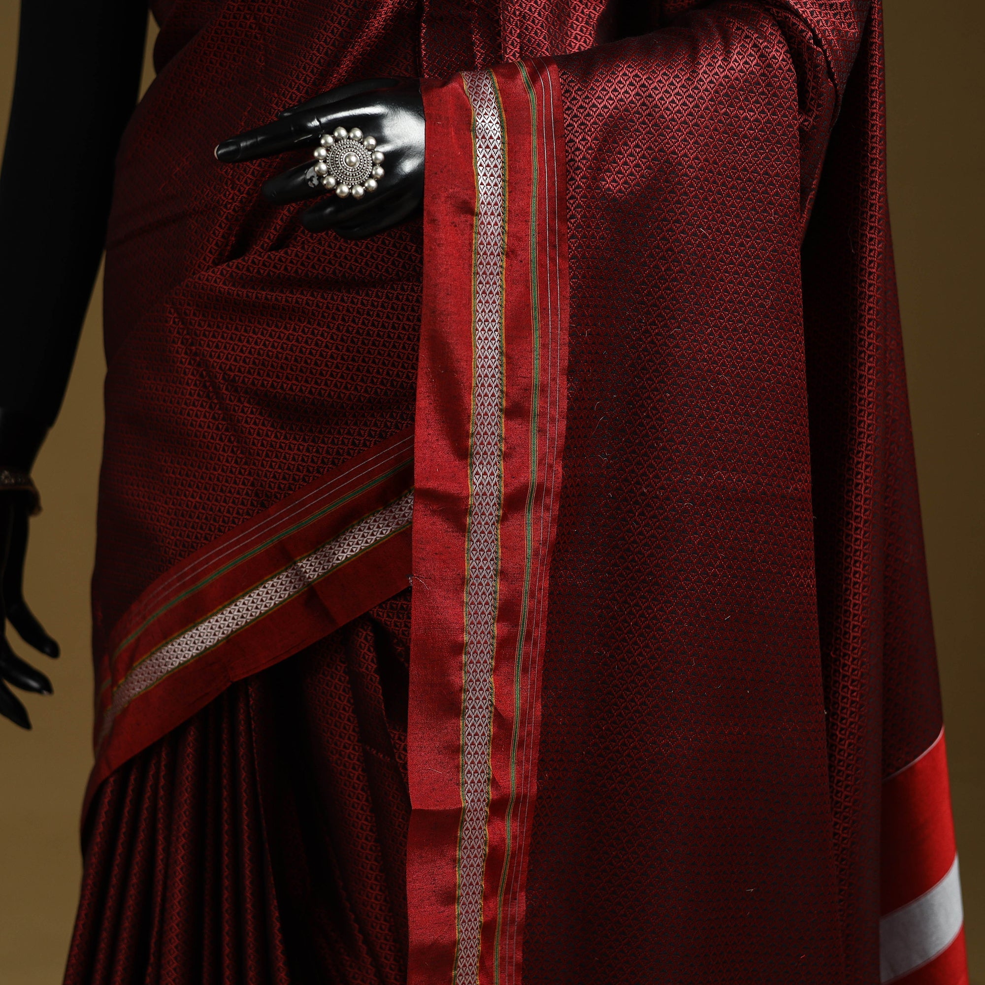 This maroonkhun saree features a traditional chikki paras border and is crafted by skilled weavers of Karnataka. Its silk cotton blend body contrasts beautifully with the Ilkal style pallu, adding depth and texture to the drape. A graceful choice for festive celebrations, cultural gatherings or elegant everyday wear.