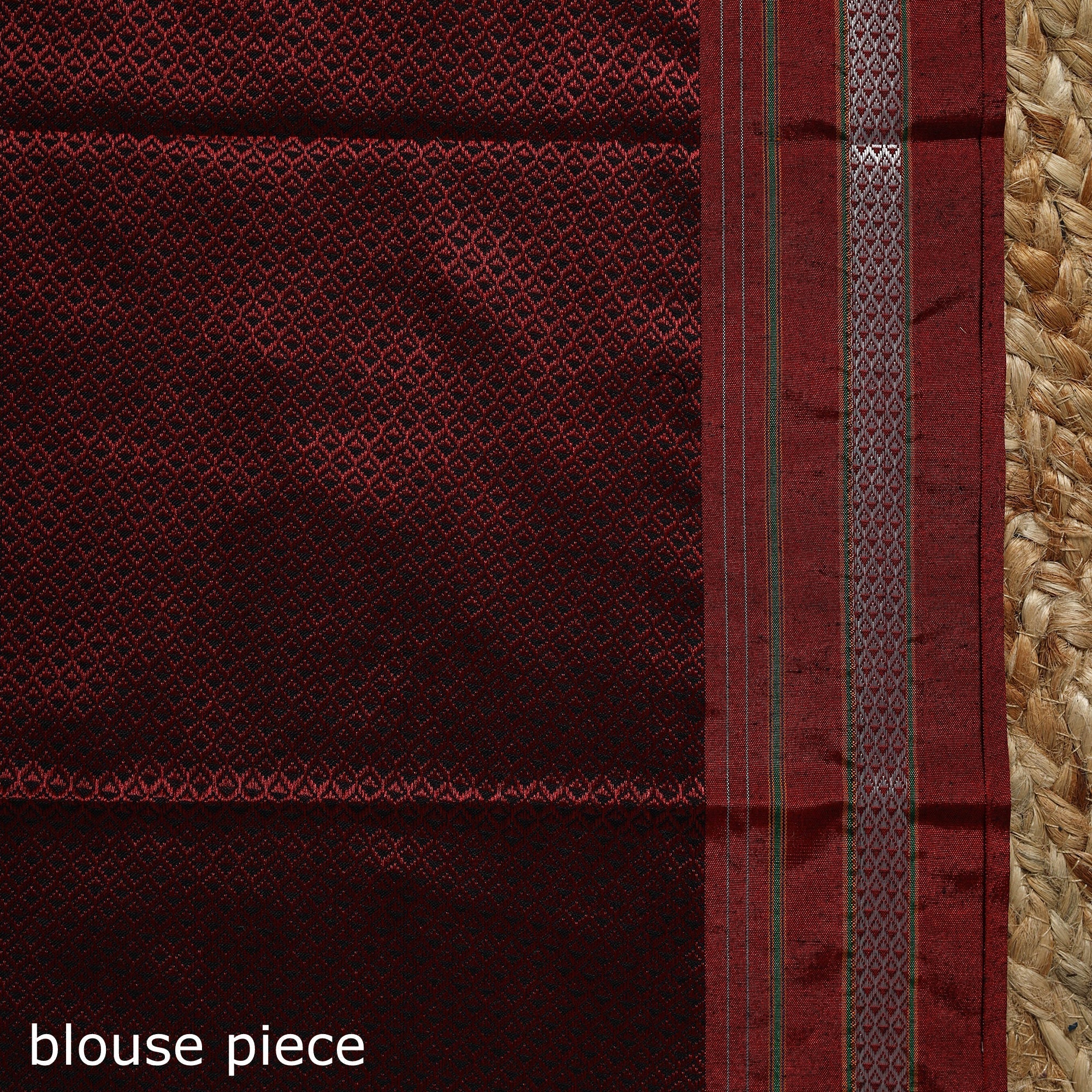 Khun is woven exclusively on a loom in Guledagudd, Bagalkot region, Karnataka. Used only for sari blouses, this handmade fabric is easily recognizable by its small white intricate motif and distinctive reddish-purple border.