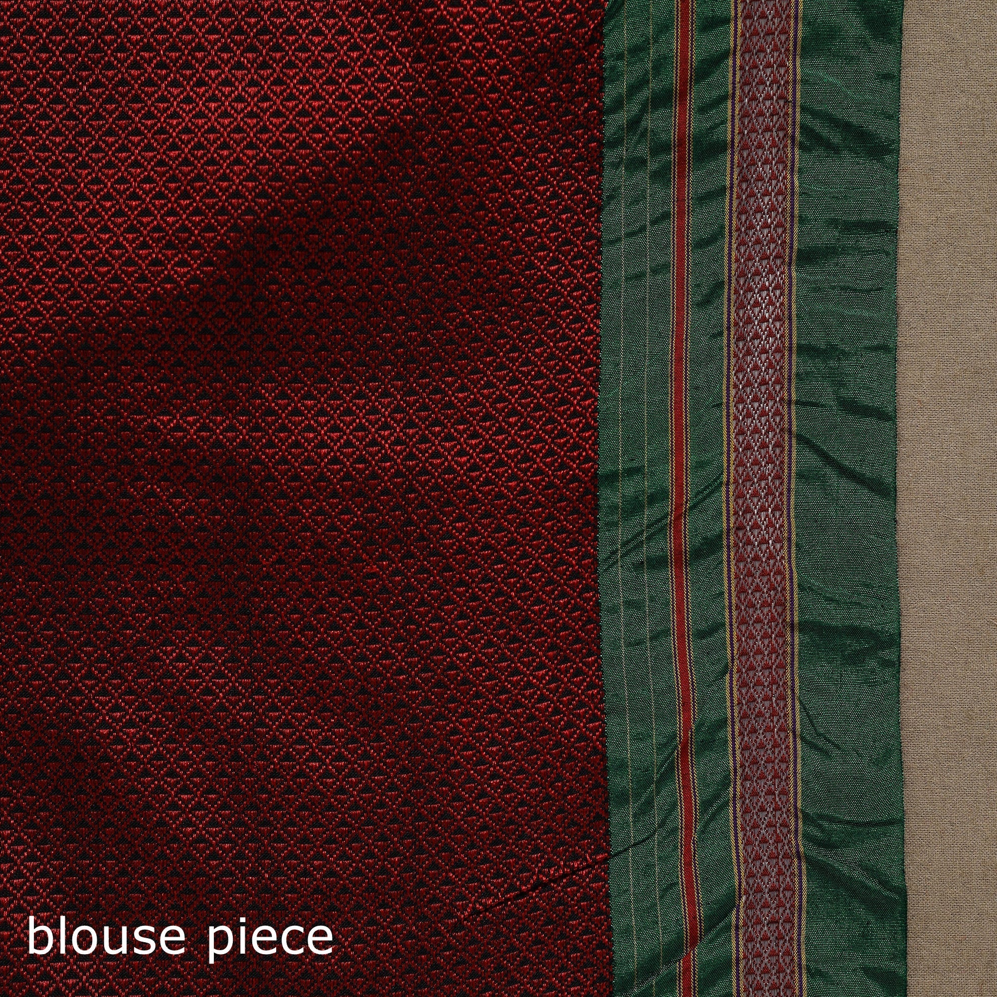 Khun is woven exclusively on a loom in Guledagudd, Bagalkot region, Karnataka. Used only for sari blouses, this handmade fabric is easily recognizable by its small white intricate motif and distinctive reddish-purple border.