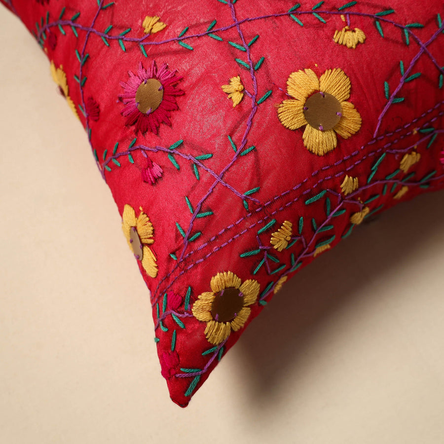 Enhance your home decor with our silk cotton red phulkari hand embroidery cushion cover. This cushion cover is inspired by traditional Phulkari art, It is the art of making beautiful, intricate designs and motifs on fabrics with different coloured threads. Perfectly suited for decorating sofas, beds and chairs, comfortable and stylish ambiance in your home.