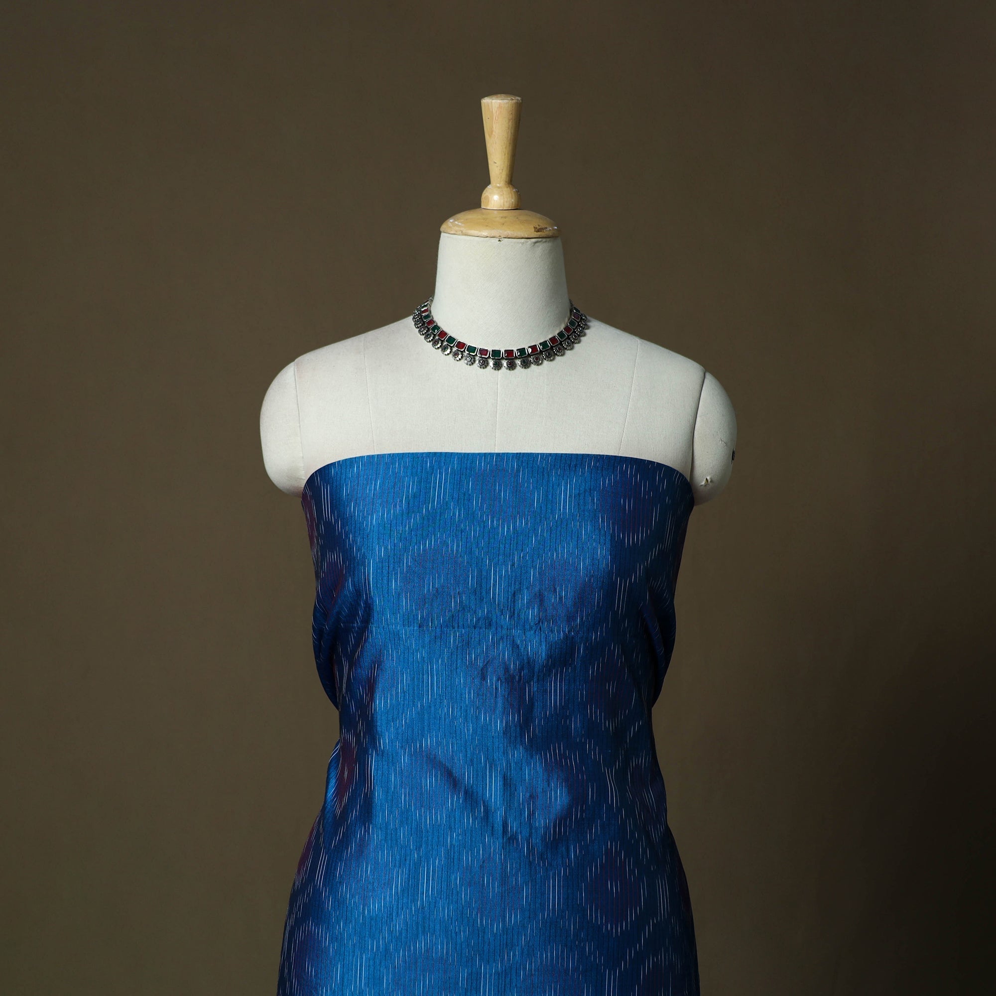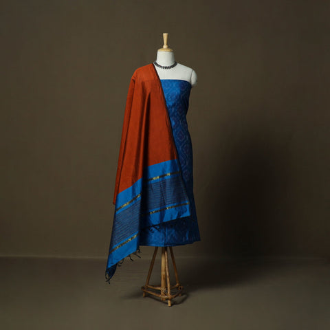 Pochampally ikat silk cotton 2pc unstitched dress material is woven by skilled weavers from Telangana using a resist-dye technique that is thousands of years old. Each thread is dyed before weaving to create the signature intricate Ikat patterns, the set includes kurta fabric with a matching dupatta, offering a graceful drape and making it ideal for tailoring elegant ethnic wear.