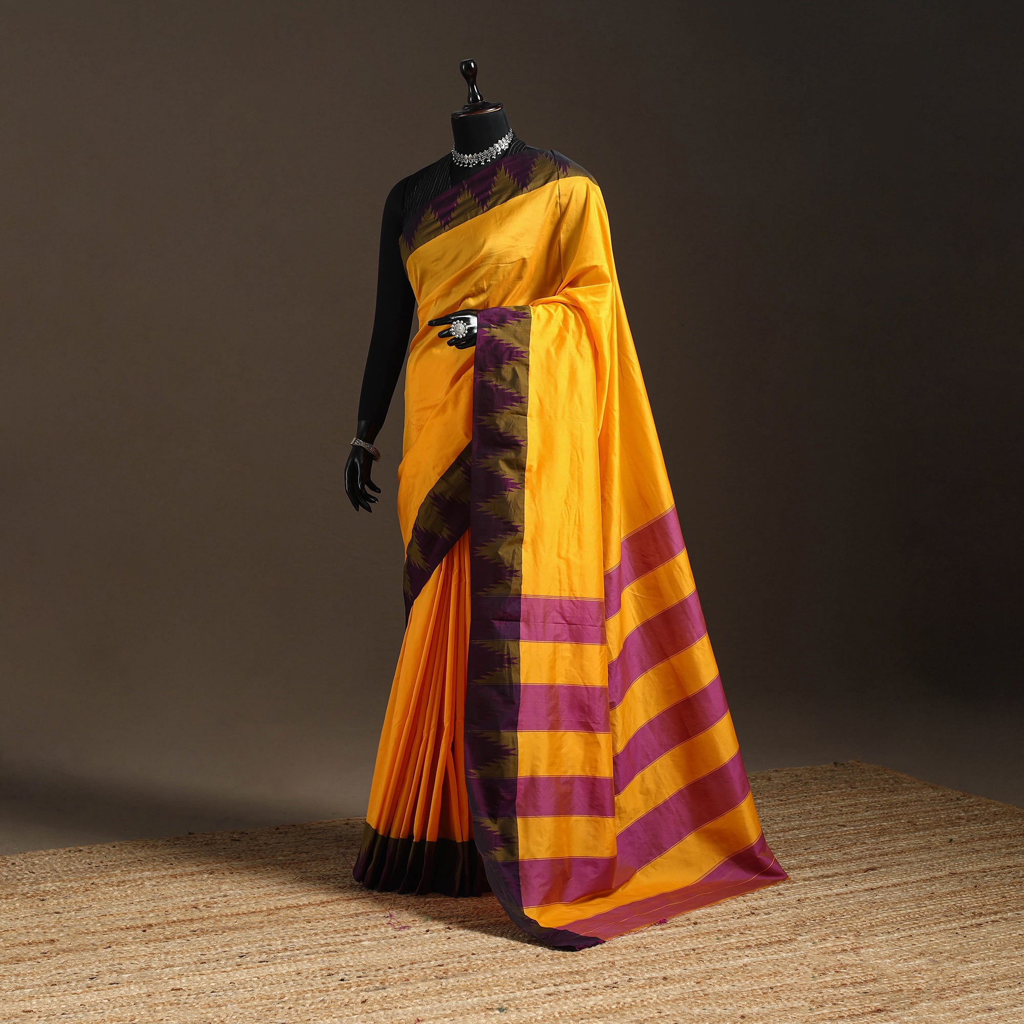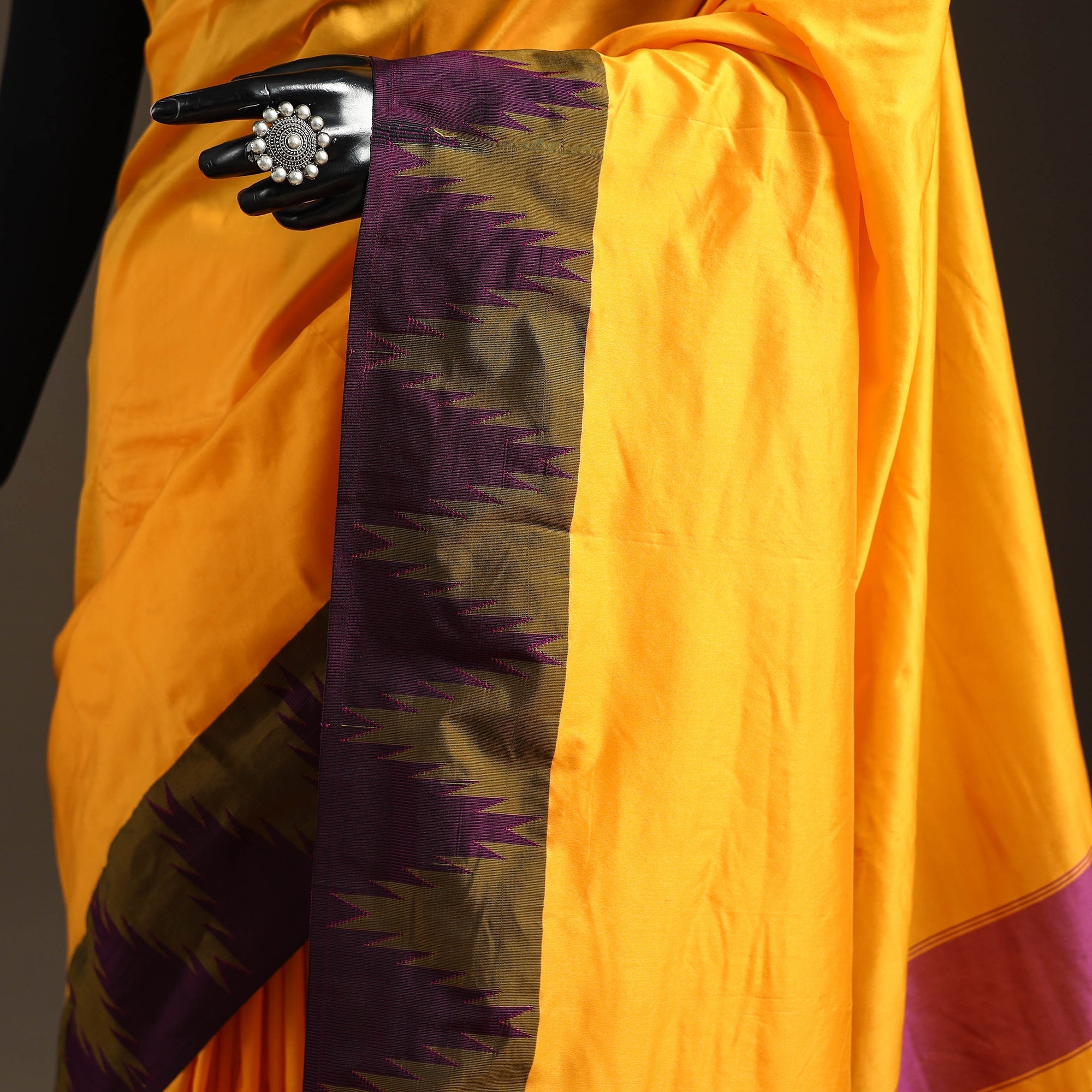 This yellow ilkal saree, featuring a traditional temple border is crafted by skilled weavers of Karnataka. Woven using the Ilkal technique, it is made from silk that gives the drape a rich sheen and smooth texture. This saree is an elegant choice for festive celebrations, cultural gatherings or graceful everyday wear.